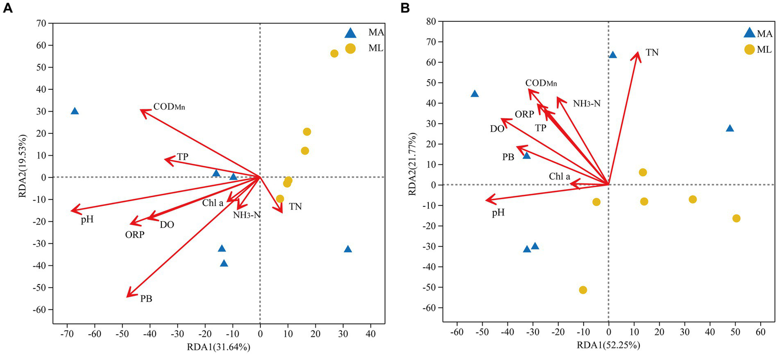 The environmental factors, including TN, TP, NH3-N, CODMn, Chl a, pH, and ORP, were not significantly different between the MA and ML areas (p > 0.05). However, the TN, TP, CODMn, pH, and NH3-N contents in the MA area were slightly higher than those in the ML area (Supplementary Table S2). The DO, WD, and WT/WD were significantly different between the two areas (p < 0.05), and the DO content and WT/WD were significantly higher in the MA area than in the ML area, whereas the WD showed the opposite change (Supplementary Table S2). The PB and PC were significantly higher in the MA area than in the ML area (Supplementary Table S2).