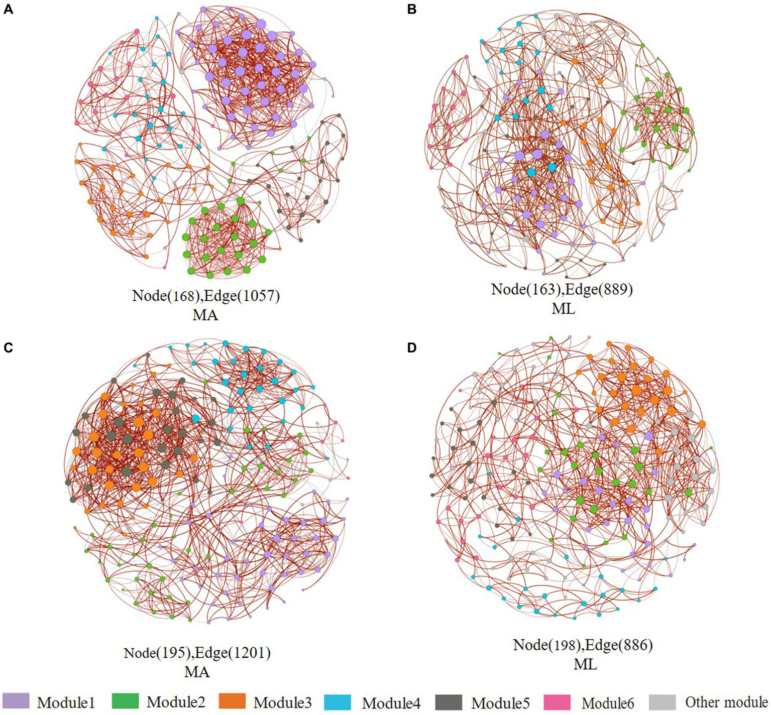Co-occurrence networks of the sediment and water bacteria community in the submerged macrophyte abundant area (MA) and the submerged macrophyte loss (ML) area. The size of each node is proportional to the number of connections (i.e., degrees) and they are classed according to the modularity (aggregation of similar functions into one module). The red and blue edges (lines) in the network indicate significant positive and negative correlations, respectively. Sediment bacterial networks in the MA (A) area and ML (B) area; water bacterial networks in the MA (C) area and ML (D) area.
