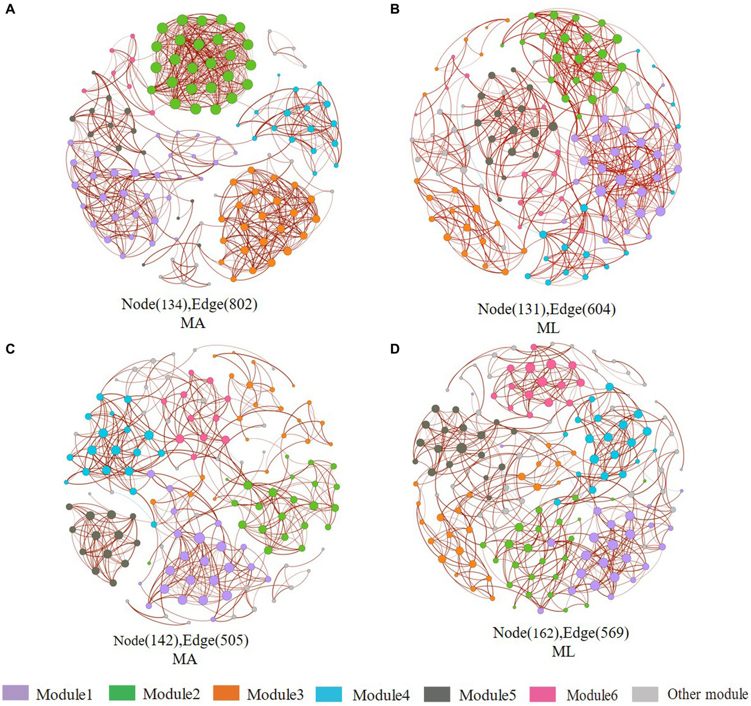 Co-occurrence networks of the sediment and water archaea community in the submerged macrophyte abundant (MA) area and the submerged macrophyte loss (ML) area. The size of each node is proportional to the number of connections (i.e., degrees) and they are classed according to the modularity (aggregation of similar functions into one module). The red and blue edges (lines) in the network indicate significant positive and negative correlations, respectively. Sediment archaea networks in the MA (A) area and ML (B) area. Water archaea networks in the MA (C) area and ML (D) area.