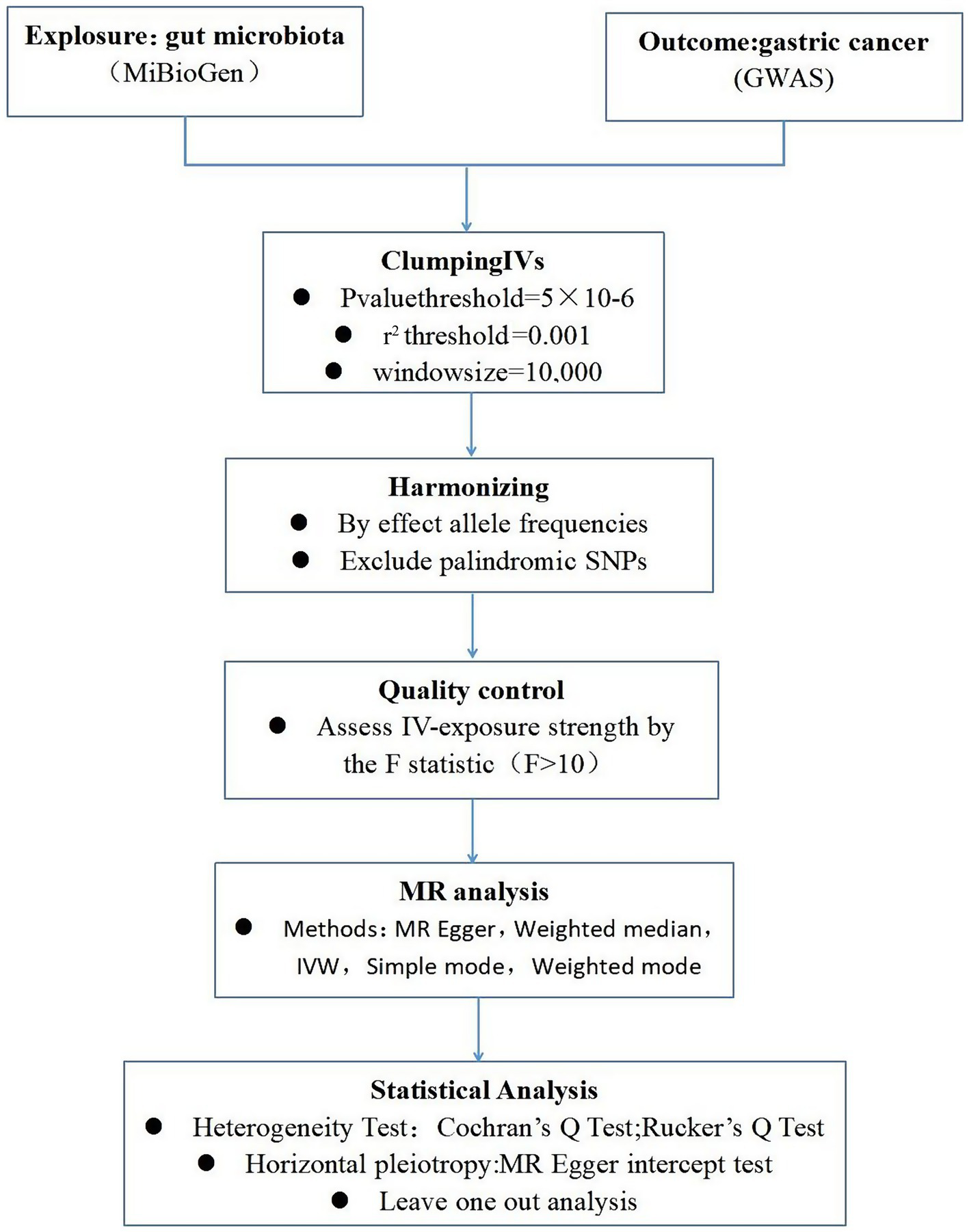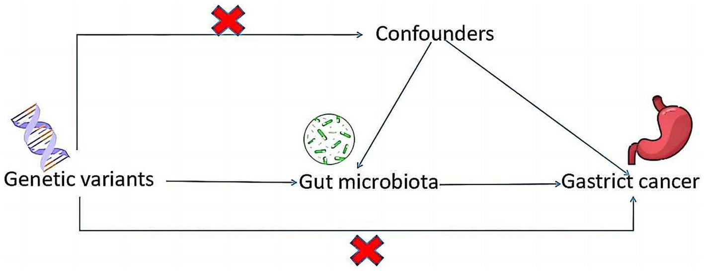 The gut microbiota’s role in host health is gaining acknowledgment, underscoring the need to connect gut flora with disease processes and to harness these insights for breakthroughs in disease prevention, diagnosis, and treatment. Currently, although there are studies related to the properties of the gut microbiota in gastric cancer patients, most of them are observational. Traditional observational studies have encountered difficulties in establishing causal relationships between gut microbiota and cancer risk because they are susceptible to confounding variables such as dietary patterns, environmental factors, and reverse causality effects (Birney, 2021; Yang et al., 2023). Hence, a robust methodology is essential for causal analysis. Mendelian Randomization (MR) analysis employs genetic variants, such as Single Nucleotide Polymorphisms (SNPs), as instrumental variables, drawing upon the principle of Mendel’s law of independent assortment (Sekula et al., 2016). This approach, which considers the genetic allocation at conception as akin to the randomized conditions found in controlled experiments, allows observational studies to address challenges like residual confounding and reverse causality, thus enhancing their reliability (Birney, 2021). Investigating the causal link between gut microbiota and gastric cancer through MR analysis is pivotal for elucidating pathogenesis and refining treatment modalities. Our study aims to elucidate this causal relationship using MR, advancing the understanding of gut microbiota’s role in gastric cancer risk.