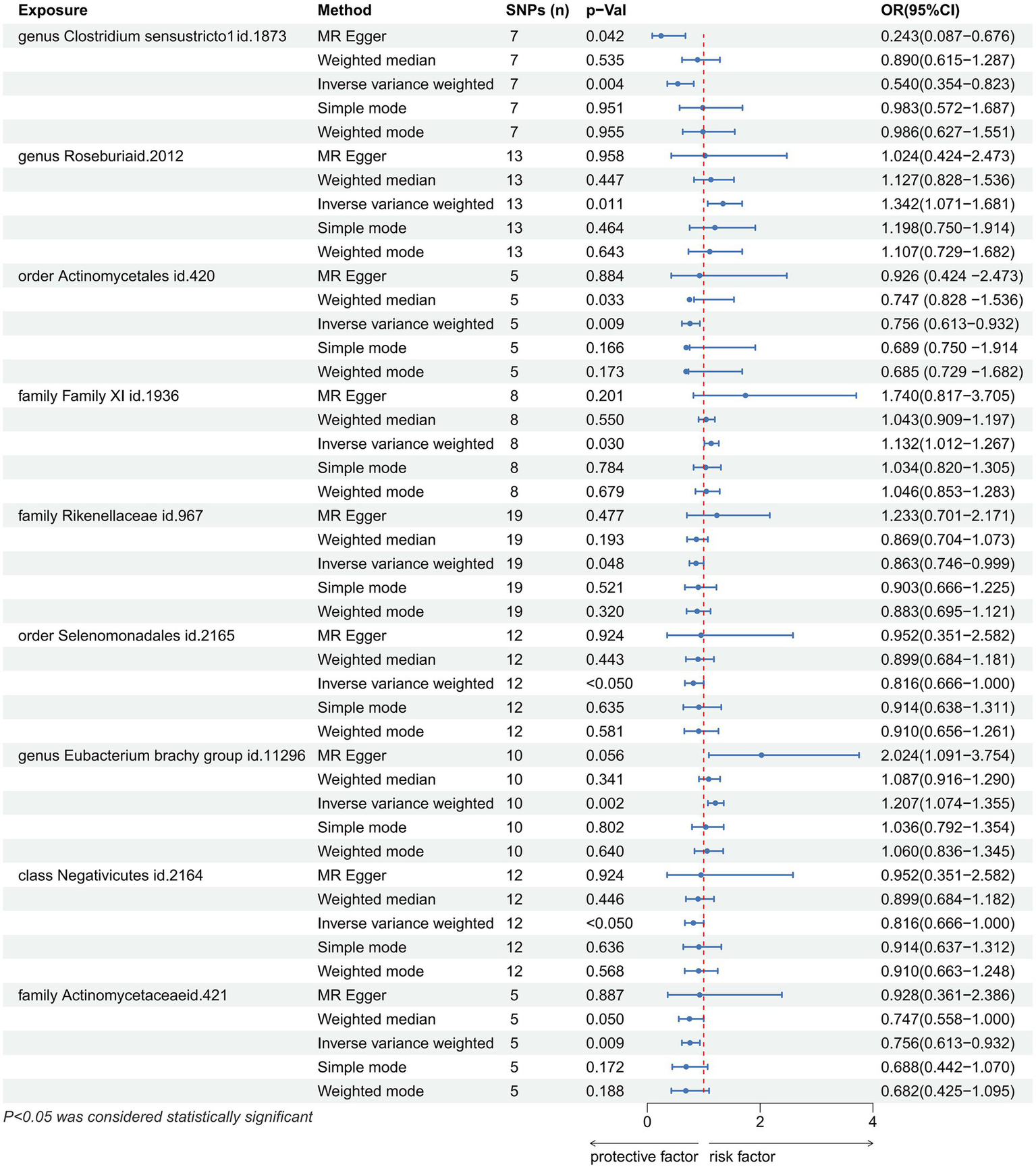 | Genus Clostridium sensustricto1 | MR Egger | 7 | 0.042 | 0.243 (0.087–0.676) |
