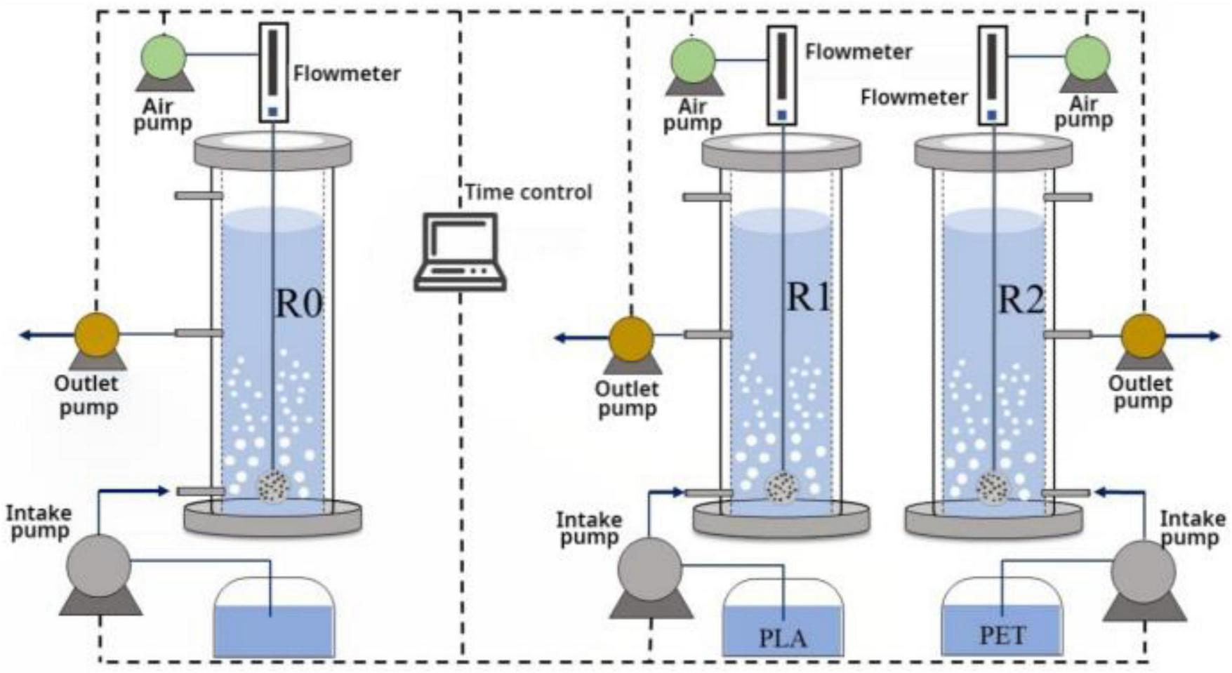 The three SBR reactors (R0, R1, and R2) were operated under the very same conditions, with each cycle lasting for 4 h cycles. Each cycle included 10 min of anaerobic feeding with 0.375 L wastewater with MPs, 50 min of anerobic, 165 min of aerobic reaction, and 5 min for settling, draining, and standing each. The influent of R1 was added with the biodegradable MPs (Polylactic Acid, PLA) and the influent of R2 was added with the non-biodegradable MPs (Polyethylene Terephthalate, PET) (Figure 1). The entire reaction time was controlled by a time control device. To prevent MPs in the synthetic wastewater from precipitating and aggregating, magnetic stirrers with 200 rpm were used to continuously stir the wastewater to make MPs dispersing relatively evenly in the wastewater.