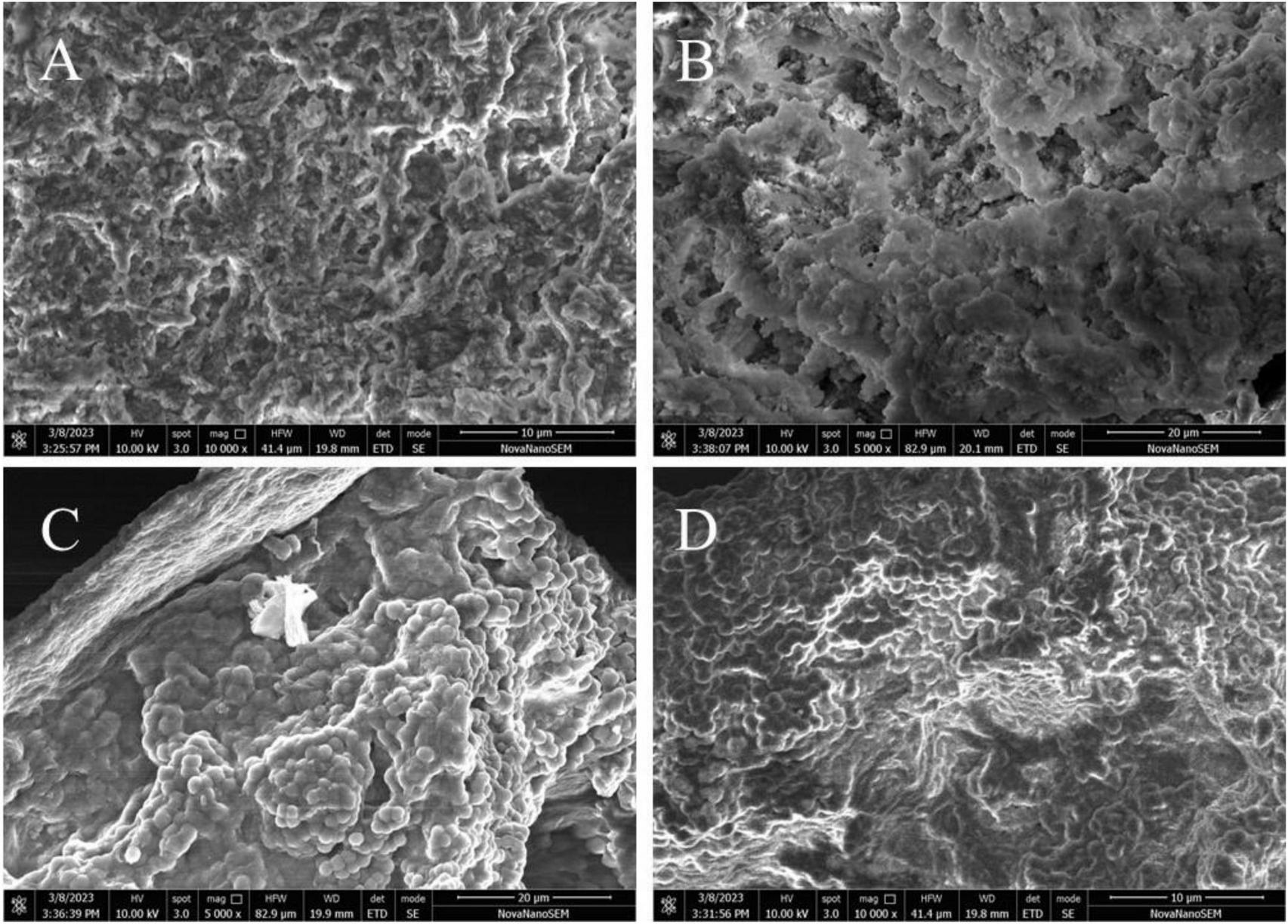 SEM images of sludge in the reactor at the end of stage P (A), at the end of stage III in R0 (B), R1 (C) and R2 (D).