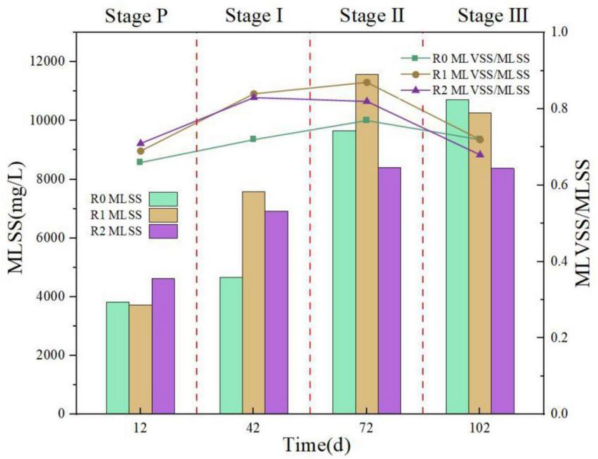 Sludge concentration is a crucial indicator of biomass in the SBR reactor, as depicted in Figure 3. On day 12 (end of Stage P), the sludge concentration of R0, R1 and R2 reactors were 3831 mg/L, 3732 mg/L, and 4635 mg/L, respectively. The MLVSS/MLSS ratios were 0.66, 0.69, and 0.71. Respectively, at this point, the sludge volume and biomass concentration of the three reactors were essentially the same and had stabilized at this level. After adding 10 mg/L of PLA and PET to R1 and R2 reactors for 30 days (end of Stage I), the sludge concentration in R1 and R2 reactors was significantly higher than that in R0 reactor. Additionally, the values of MLVSS/MLSS also increased, indicating that low concentration of MPs promoted the growth of sludge. At the end of Stage II (day 72), the sludge concentration in the R1 reactor continued to rise remarkably (48.3%) and the sludge concentration was higher than that of R0. However, R2 displayed a much lower increase (18.5%) in sludge concentration. The MLVSS/MLSS value of R2 was also decreasing. It indicated that PLA (50 mg/L) enhanced on the sludge growth of R1, while PET (50 mg/L) showed little positive effects on the increase of sludge concentration, resulting in a lower sludge concentration in R2 compared to R0 by the end of the stage II. At the end of Stage III, after 103 days, only the sludge concentration in R0 reactor had increased. In contrast, the sludge concentration in both R1 and R2 reactors had decreased, and the MLVSS/MLSS values had decreased more rapidly than those in R0 reactor. These results suggest that the growth of sludge is inhibited and the biomass is decreasing at a microplastic concentration of 100 mg/L.