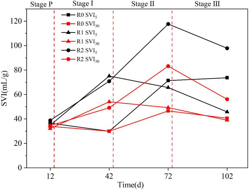 In the Stage II and III, a continuing reduction of SVI5 and SVI30 was observed with R1, suggesting that the presence of PLA (50, 100 mg/L) contributed to the granulation of sludge and its settling properties. At Stage II, the granular sludge had started to adapt to PLA, with an onset of improvement in settling performance. Differently, it was not until Stage III that both SVI5 and SVI30 parameters of R2 began to decrease, suggesting that PET of 50 mg/L adversely affect the growth and settling performance of the sludge. At the same MPs concentration, granular sludge exhibits poorer adaptability to the non-biodegradable PET than the biodegradable PLA, requiring a longer time to adjust to PET than PLA. Geng et al. (2021) also found that without adding MPs, the granules lost their morphological integrity, leading to a deterioration of settling properties during prolonged operation.