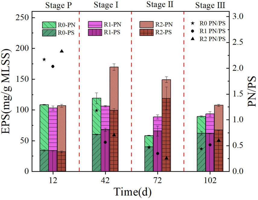 EPS is a macromolecular substance distributed on the cell surface that promotes microbial aggregation, is an important part of microbial aggregates, and plays a crucial role in resisting toxic and harmful substances. The experiments measured the EPS of the three reactors at Stage P∼III, as shown in Figure 5. At the end of Stage P, the content of EPS and PN/PS of the three reactors were similar. During Stages I-III, the EPS content in the R0 reactor fluctuated, while the R1 reactor remained more stable. Both R0 and R1 reactors showed their lowest values during Stage II, with 58.38 mg/g MLSS and 88.66 mg/g MLSS, respectively. The EPS content in the R2 reactor increased significantly during Stage I, but then decreased continuously, reaching its lowest value of 107.56 mg/g MLSS during Stage III. Research has demonstrated that PE an stimulate the production of EPS by AGS (Jachimowicz et al., 2022; Zheng et al., 2022). Similarly, PET, another non-biodegradable MPs, was found to have a promoting effect on the production of EPS by AGS in experimental results.