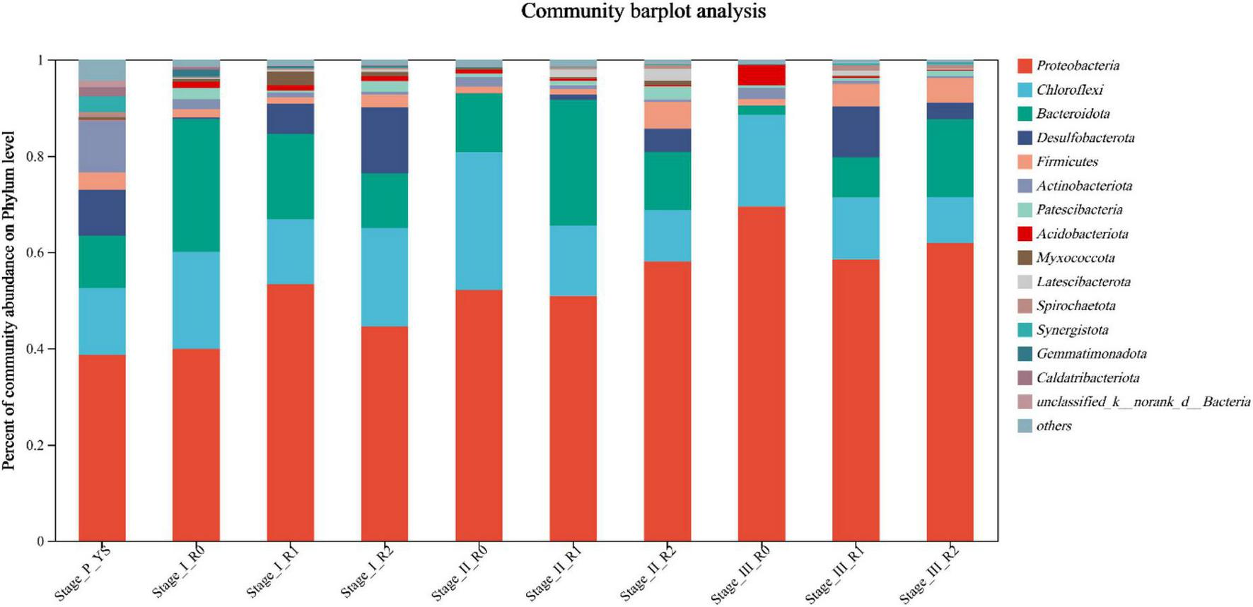 Abundance change analysis was conducted on the phylum with relative abundance greater than 1%, while the remaining bacteria were categorized as ‘other’ at the phylum level. Figure 7 shows that the phylum Proteobacteria was the dominant phylum in the original control sludge. The abundance of Proteobacteria in the R0 reactor increased with the operation of the reactor, from 38.7% in Stage P to 69.5% in Stage III. The R1 and R2 reactors also showed an overall increasing trend. Proteobacteria and Bacteroidota are the dominant phyla when sodium acetate is used as a single carbon source. One of the primary functions of the Proteobacteria phylum is the degradation of COD (Chen et al., 2023). Even though the abundance of Proteobacteria in R1 and R2 did not decrease during Stage III, the efficiency of COD removal by both R1 and R2 was significantly reduced. According to the study, high concentration of MPs obstructed the nutrient transport pathway in the AGS, resulting in a considerable reduction in COD removal by the AGS.