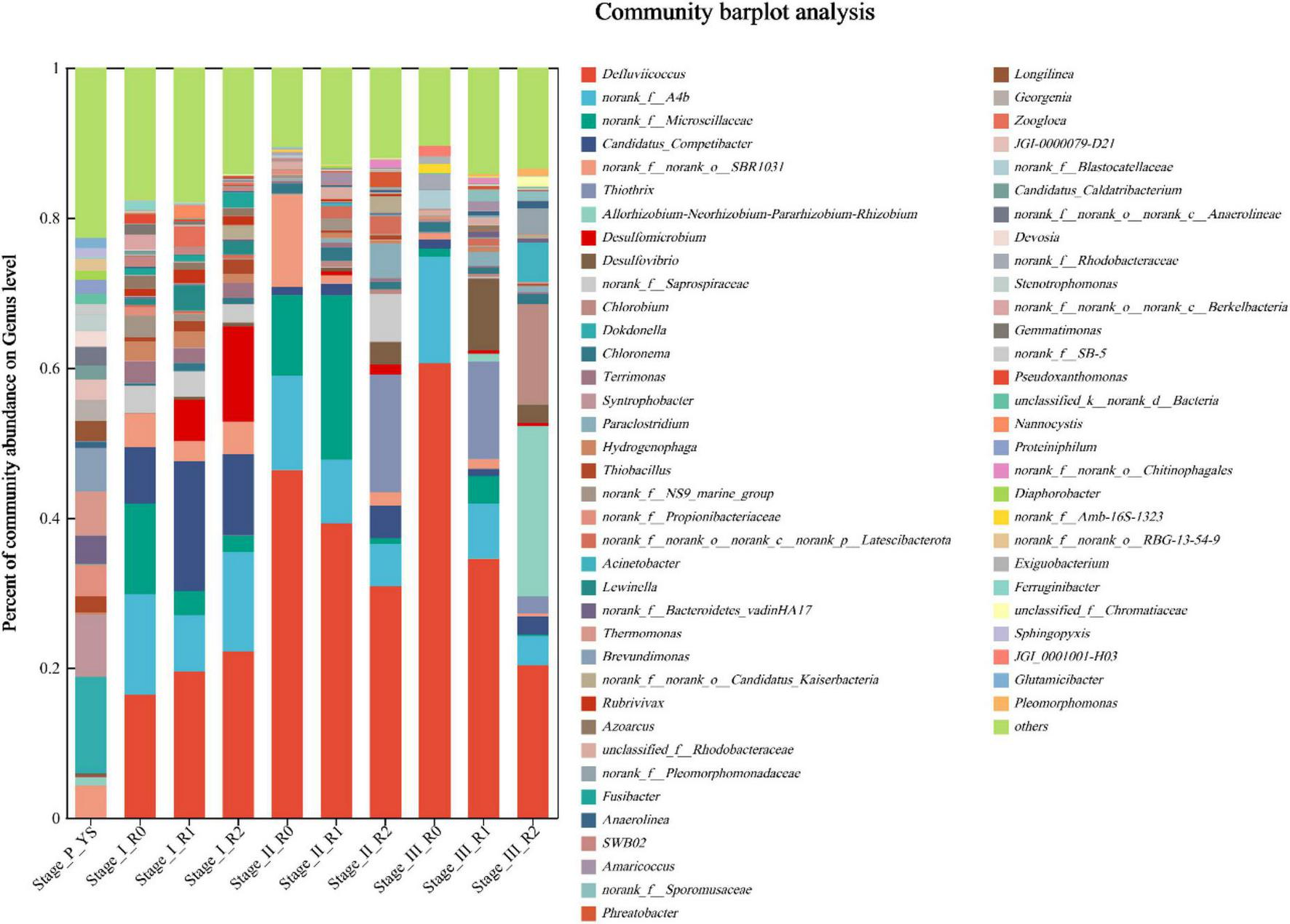 After the addition of MPs, the abundance of Chloroflexi in the R1 and R2 reactors was consistently lower than in the R0 reactor. This may be due to the reduced light intensity in the reactors caused by the MPs. Chloroflexi is capable of photosynthetic autotrophy (Shih et al., 2017), which could explain its higher abundance in the R0 reactor. Additionally, the abundance of the Desulfobacterota phylum in R0 reactor during Stages I to III was 0.36%, 0.03%, and 0.09%, respectively. Nevertheless, the abundance of Desulfobacterota in the R1 reactor was 6.33% at Stage I, 1.14% at Stage II, and 10.51% at Stage III. The abundance of Desulfobacterota in R2 reactors during Stages I to III was 13.71%, 4.77%, and 3.40%, respectively. The results demonstrated that the abundance of the Desulfobacterota in both R1 and R2 were much higher than that in R0. According to the research (Liu et al., 2021), Desulfobacterota is associated with sulfur and phosphorus cycling in the water column. Therefore, phosphorus removal efficiency was promoted by PLA and PE in R1 and R2 reactors, compared to R0 reactor without MPs.