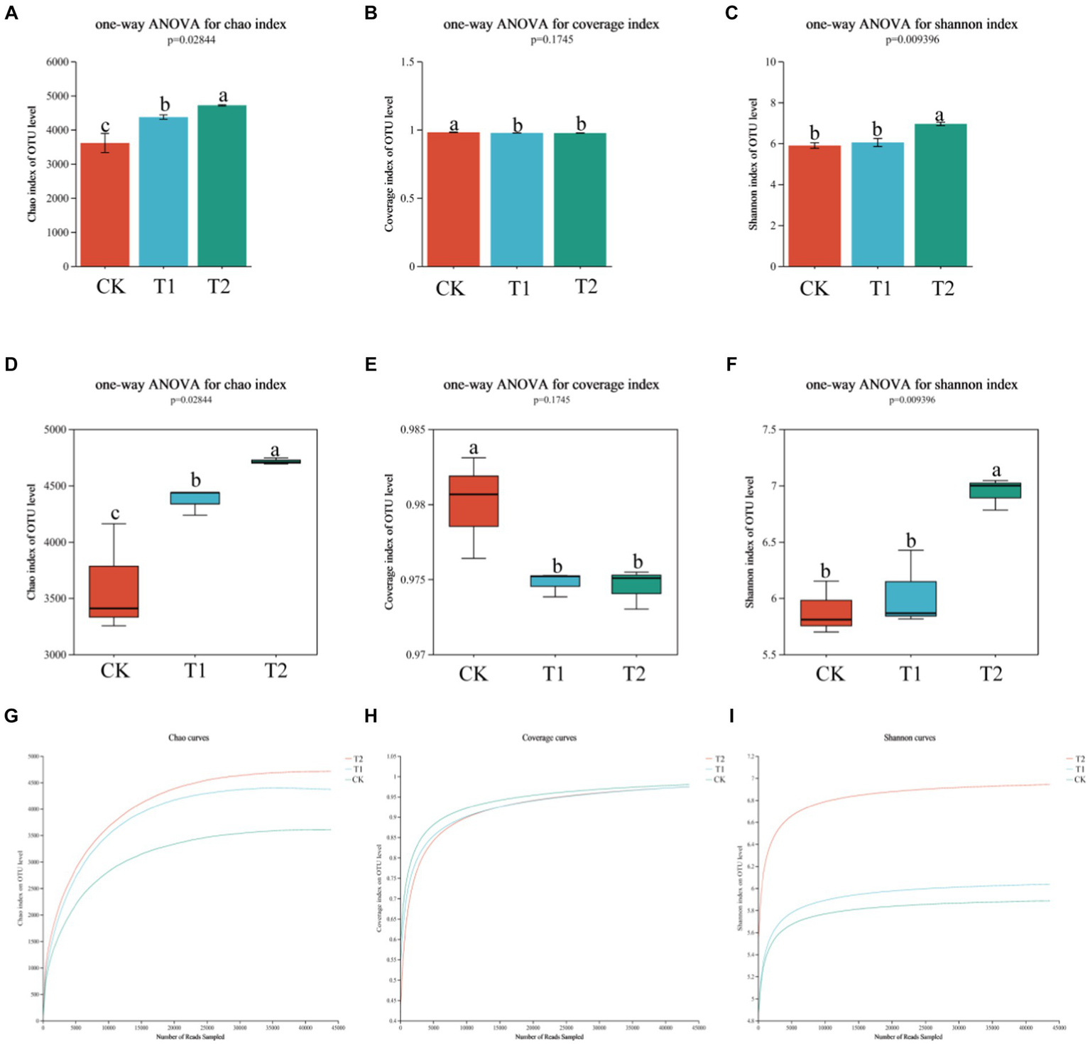 The analysis of bacterial α diversity in tobacco-planting soil with different previously cultivated crops. Different letters indicate significant differences between treatments (p < 0.05). (A) the bar graph of Chao1 index; (B) the bar graph of coverage index; (C) the bar graph of Shannon index; (D) the box graph of Chao1 index; (E) the bar graph of coverage index; (F) the bar graph of Shannon index; (G) the dilution curve of Chao1 index; (H) the dilution curve of coverage index; (I) the dilution curve of Shannon index.
