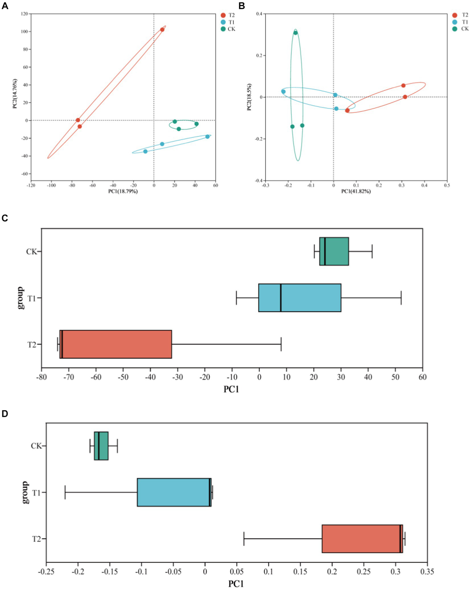 Regarding the beta diversity analysis of soil bacterial community diversity and richness, PCA and PCoA revealed the similarities and differences of the bacterial communities among the different treatments. The box diagram more intuitively showed the interpretability value of the PC1 axis between the treatments and the dispersion of the distribution of the treatments on the PC1 axis. PCA and PCoA figures showed no crossover between CK and T2, indicating significant differences in soil bacterial community diversity and richness under both treatments (Figure 3).