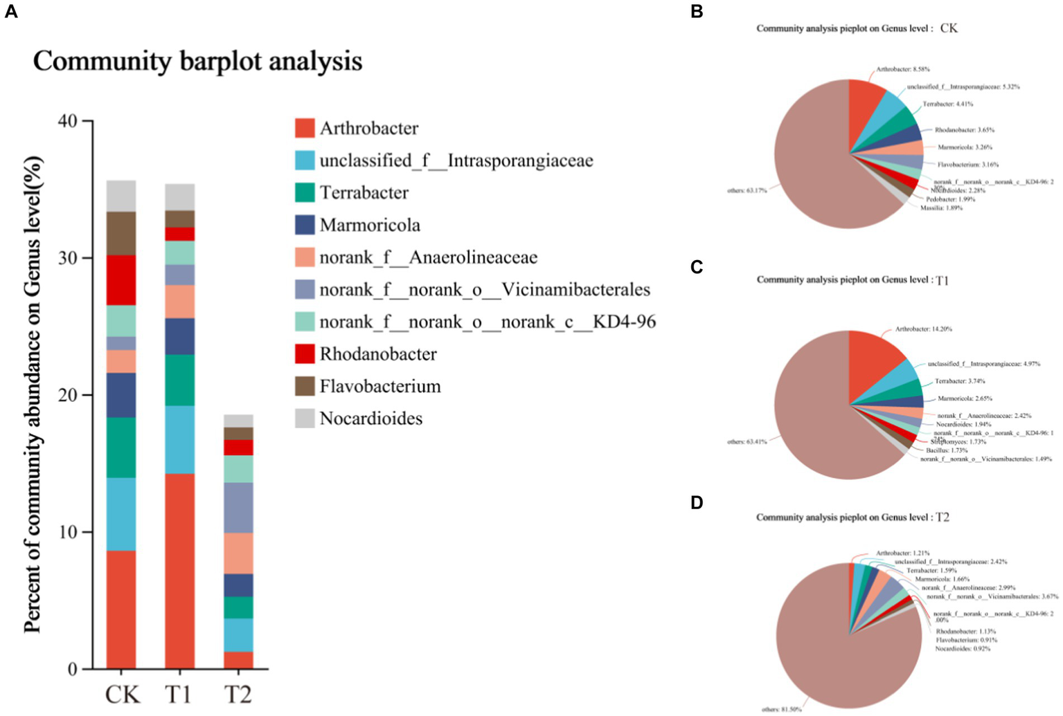 Composition of rhizosphere bacterial community in tobacco-planting soil cultivated with different preceding crops. (A) the community of barplot analysis; (B) the community analysis pieplot of CK bacterial communities on genus level; (C) the community analysis pieplot of T1 bacterial communities on genus level; (D) the community analysis pieplot of T2 bacterial communities on genus level.