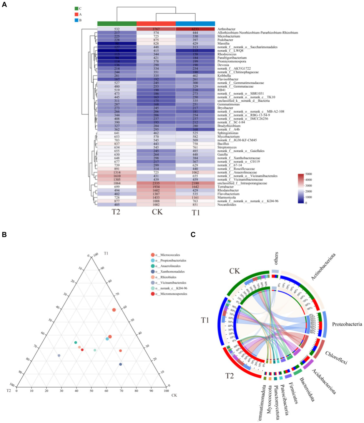 Relationship between rhizosphere bacterial community composition of the different preceding crops and tobacco-planting soil properties. (A) the heatmap of soil bacterial communities among different treatments; (B) the ternary analysis of CK, T1 and T2 on family level; (C) the circos analysis of CK, T1 and T2 on phylum level.