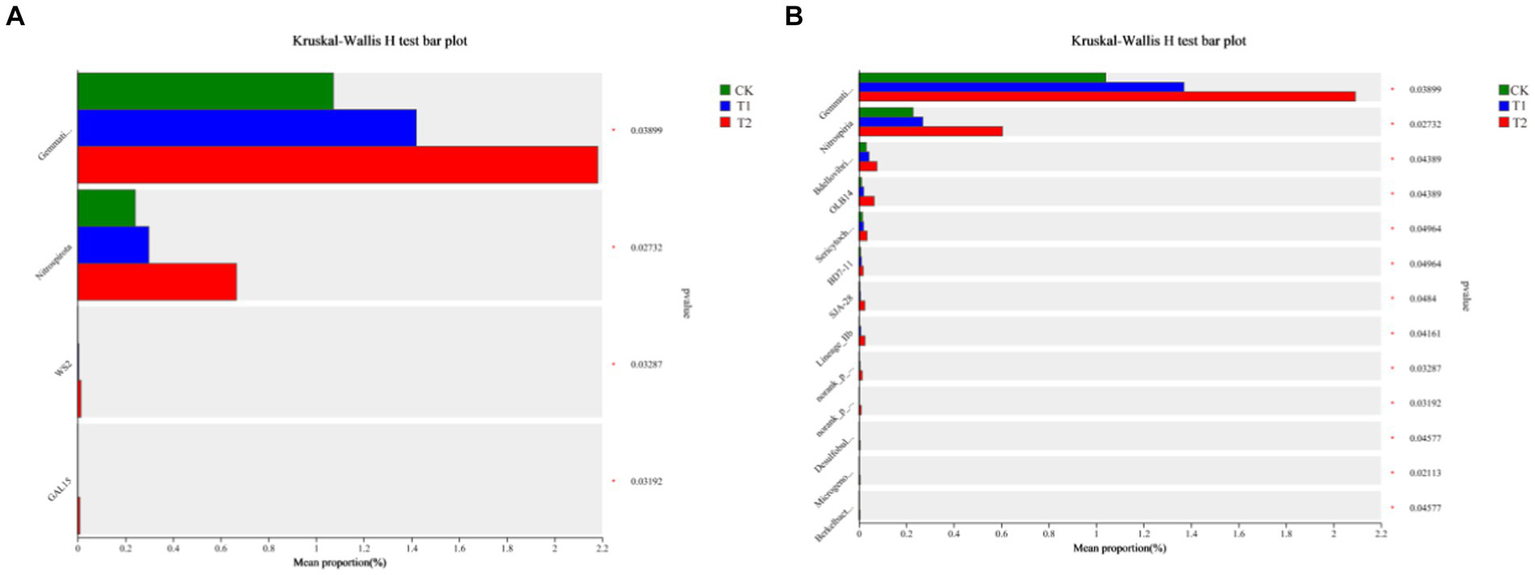 Difference analysis of bacterial species in tobacco-planting soil cultivated with different preceding crops. (A) the Kruskal-Wallis H test bar plot of CK, T1 and T2 on class level; (B) the Kruskal-Wallis H test bar plot of CK, T1 and T2 on phylum level.