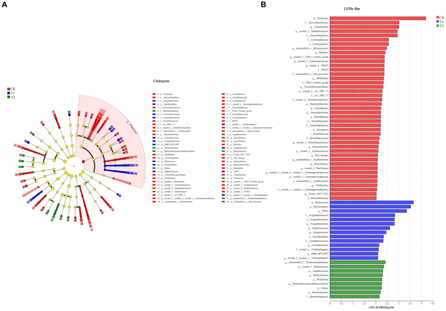 Figure 6 indicates the species composition of the soil bacterial communities under different preceding crops, assessed with a heatmap, sample clustering tree analysis of treatment, species relationships, and a Ternary phase diagram. The species composition varied significantly among different treatments, but the species composition of bacteria under the CK and T1 treatments was generally similar (Figure 6). At the phylum level, the dominant bacteria under different treatments were identical, with Actinobacteriota accounting for 36.00% of all sequences in CK, 40.37% in T1, and 23.34% in T2. Proteobacteria was the second dominant bacterial phylum. Its relative abundance was found under the CK, T1, and T2 (38.17, 28.12 and 34.75%), respectively. The ternary phase diagram revealed the bacterial composition characteristics of 8 families of rhizosphere soil samples under control, barley and rapeseed. Circles of the same color in the figure represent the same family, and the circle area size represents their abundance. The results showed that the composition and distribution ratio of microorganisms in different samples differed, and the dominant strains under each treatment also differed. At the phylum level, Gemmatimonadota, Nitrospirota, WS2, and GAL15 were significantly different (p < 0.05) among the treatment, and the dominant phyla in T2 had a greater abundance than other treatments (Figure 7). The 13 most abundant classes reached a significant level at the class level. Through LEfSe difference analysis with an LDA threshold of 2, microorganisms with substantial differences were screened out in the three tobacco planting soils with different preceding crops (Figure 8).