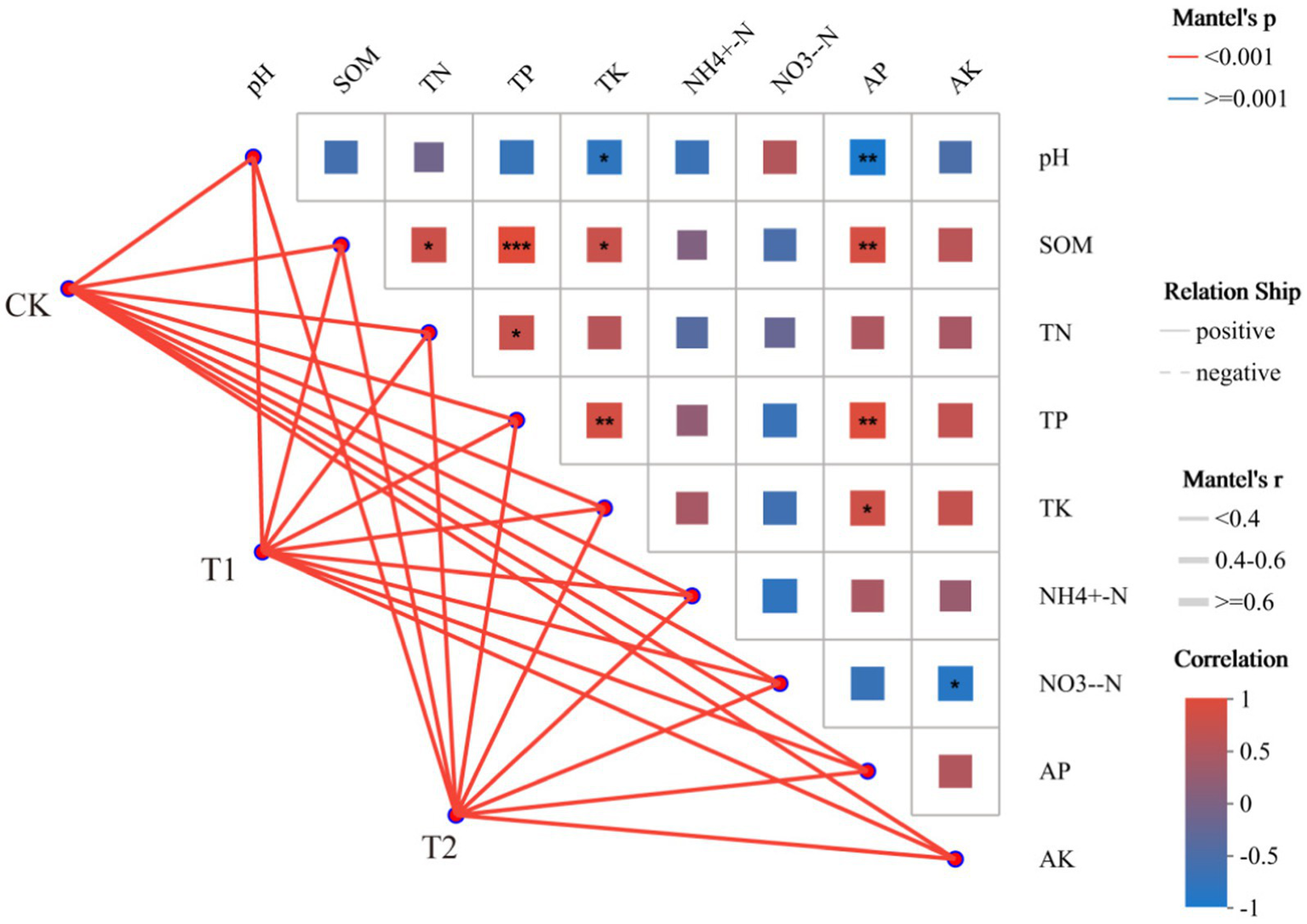 The correlation between soil environmental factors and bacterial community status in tobacco-planting soil cultivated with different preceding crops was assessed with a Mantel Test network heat map analysis (Figure 9). The lines in the figure represent the correlation between community and environmental factors and the heat map represents the correlation between environmental factors. The line thickness represents the magnitude of the correlation between the community and environmental factors, and positive and negative indicate the positive and negative correlations between the community and environmental factors. In the heat map, different colors represent positive and negative correlations. Colour depth represents the magnitude of positive and negative correlations, and asterisks in colour blocks represent significance. Soil environmental factors and bacterial community properties after cultivation with different preceding crops were positively correlated. At the same time, the correlations between environmental factors in tobacco-planting soil were different (Figure 9). SOM showed very significant positive correlation with TP (p < 0.001), while it showed no correlation with NH4+-N and NO3−-N. Among them, NO3−-N was not correlated with most environmental factors.