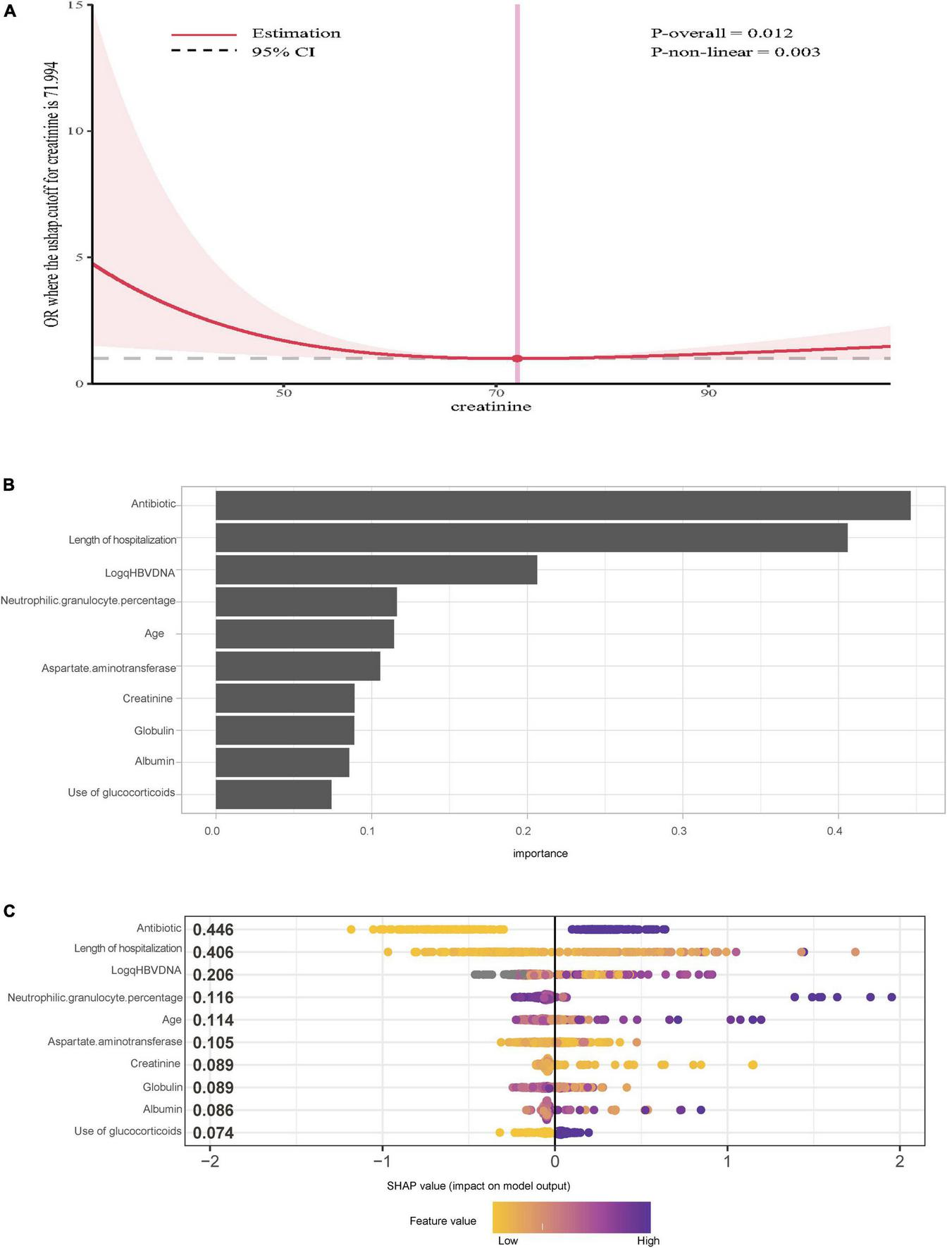 There were 24 ACHBLF patients (9.84%) who developed IFI on average 17.5 (13.50, 23.00) days after admission. The serum creatinine level showed a non-linear association with the possibility of IFI. Multiple logistic regression revealed that length of hospitalization (OR = 1.05, 95% CI: 1.02–1.08, P = 0.002) and neutrophilic granulocyte percentage (OR = 1.04, 95% CI: 1.00–1.09, P = 0.042) were independent risk factors for IFI. The XGBoost algorithm showed that the use of antibiotics (SHAP value = 0.446), length of hospitalization (SHAP value = 0.406) and log (qHBV DNA) (SHAP value = 0.206) were the top three independent risk factors for IFI. Furthermore, interaction analysis revealed no multiplicative effects between the use of antibiotics and the use of glucocorticoids (P = 0.990).