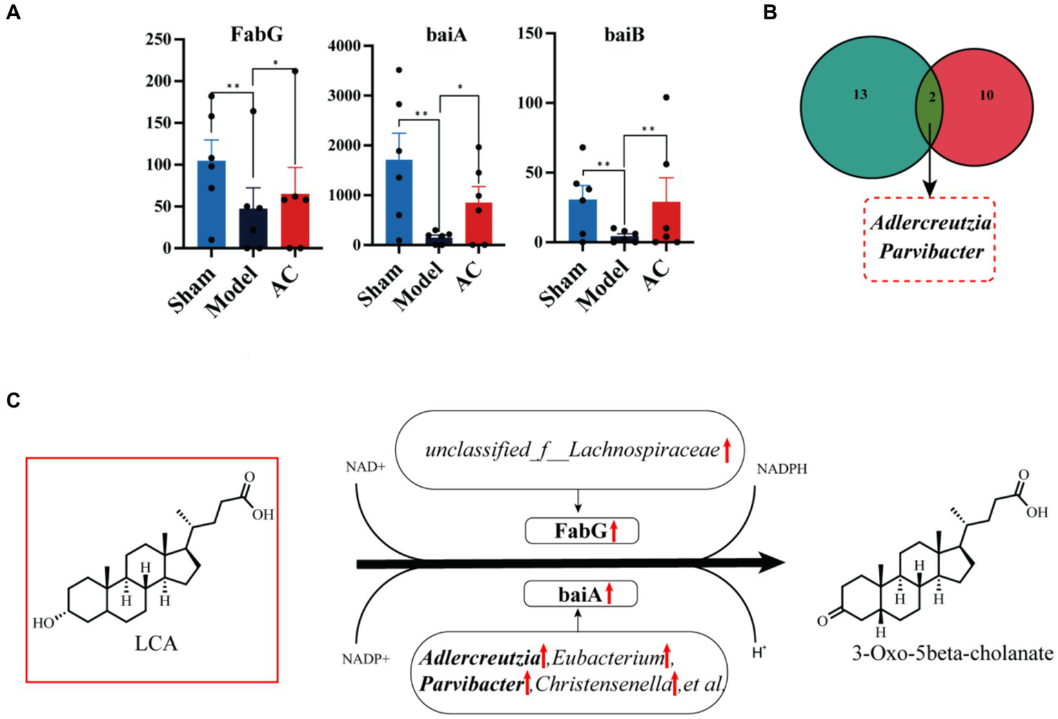 Next, we compared the expression levels of 15 genes involved in the secondary bile acid biosynthesis pathway among three groups: Sham, Model, and AC. Supplementary Table S4 provides a detailed comparison. Among these genes, FabG, baiA, and baiB showed varying abundance in the three groups. Figure 5A clearly demonstrates that the expression levels of baiB, FabG, and baiA were significantly lower in the Model group compared to the Sham group. However, after the administration of AC, these expression levels normalized (p < 0.01, p < 0.05). Analysis of the Nr database revealed that these three genes are closely associated with 33 different microorganisms, and statistically significant differences were observed in 12 of these species. Then the bacterial species Adlercreutzia and Parvibacter were obtained by Venn diagram analysis of 12 microorganisms and 15 differential bacteria analyzed by 16S rRNA sequencing (Figure 5B). Considering the analysis of bile acid variations, it is evident that the genes FabG and baiA are crucial in the secondary bile acid pathway, particularly in relation to AC treatment. Figure 5C illustrates the metabolic conversion of lithocholic acid (LCA) to 3-oxo-5beta-cholanate within the secondary bile acid biosynthesis pathway. This conversion involves a series of enzymatic reactions facilitated by specific genes and associated bacterial genera. The diagram details the upregulation of the FabG gene within the unclassified_f__Lachnospiraceae genus. This indicates that this bacterial gene is likely involved in the metabolism of LCA. Moreover, there is a significant correlation between the upregulated expression of the baiA gene and the increased abundance of bacterial genera such as Adlercreutzia, Eubacterium, Parvibacter, and Christensenella, among others. This enhanced gene expression is closely associated with the metabolic conversion of lithocholic acid (LCA) to 3-oxo-5beta-cholanate. Finally, the upregulation of baiA and baiB suggests their pivotal role in the secondary bile acid pathway.