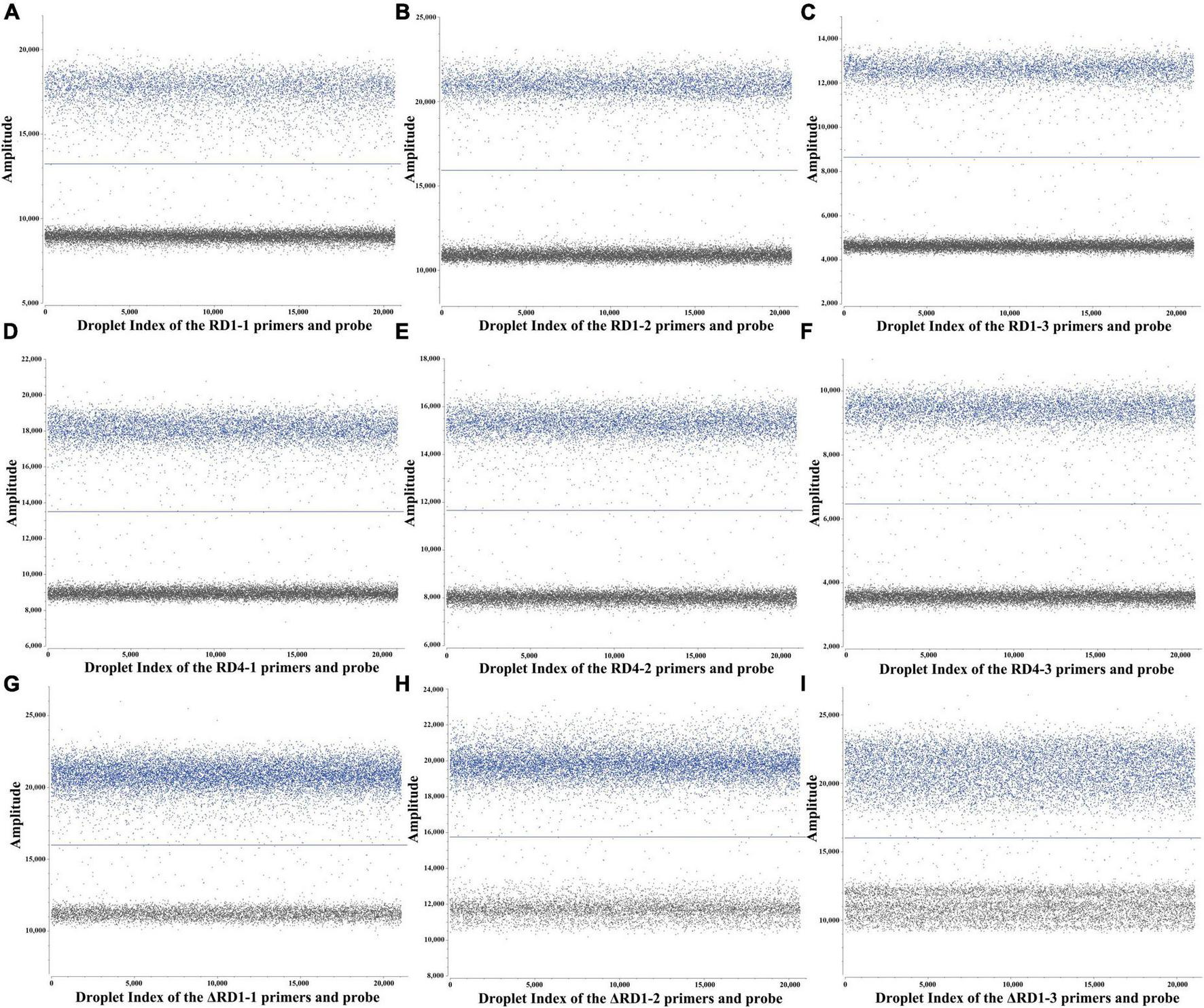 ddPCR assay for primers and probes screening. (A–C) 3 sets primers and probes screening for RD1. (D–F) 3 sets primers and probes screening for RD4. (G–I) 3 sets primers and probes screening for ΔRD1.