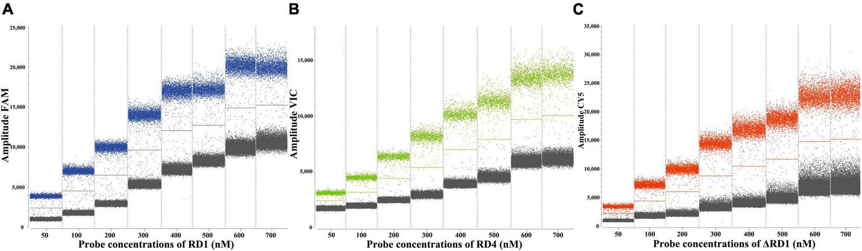 Determination of the optimal probe concentrations of the ddPCR of RD1 (A), RD4 (B), ΔRD1 (C).