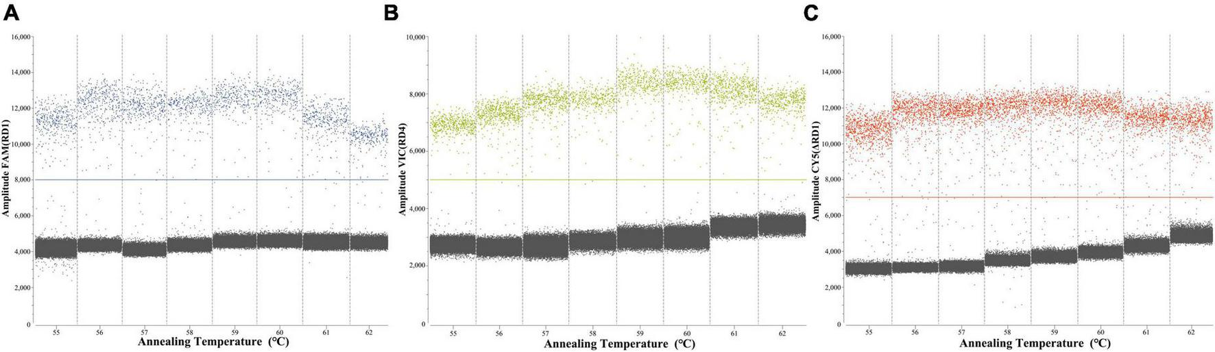 To determine the optimal ddPCR annealing temperature, each plasmid with a concentration of 4.8 × 102 copies/μL was utilized at annealing temperatures from 55 to 62°C. The result showed that the optimal annealing temperature was 60°C, which could generate the highest fluorescence amplitude (Figure 3).