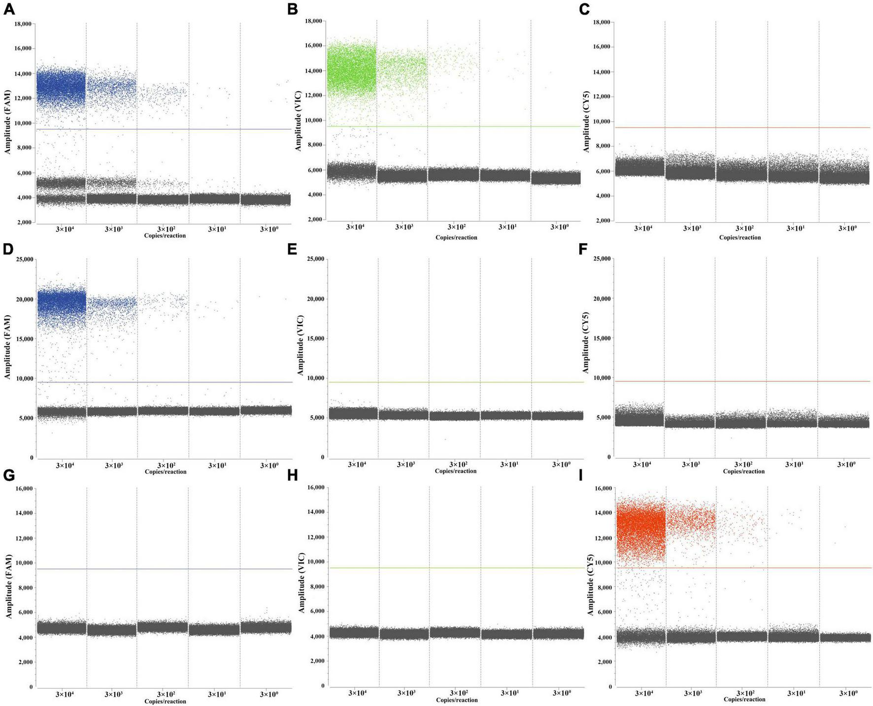 Performances of the triplex ddPCR assay by target DNA from 3 × 104 to 3 × 100 copies/μL. (A–C) Detection results of the target M. tuberculosis. (D–F) Detection results of the target M. bovis. (G–I) Detection results of the target BCG.