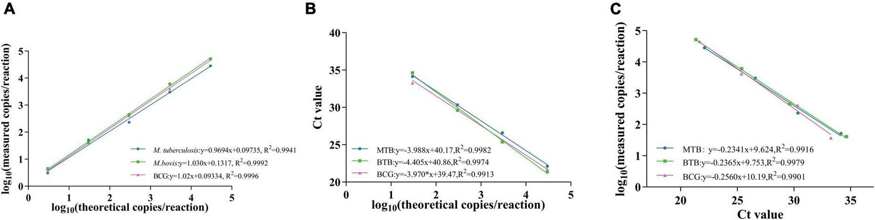 Standard curve of M. tuberculosis, M.bovis and BCG. (A,B) show the standard curves of triplex ddPCR and triplex qPCR, respectively, and (C) indicates the correlation between them.