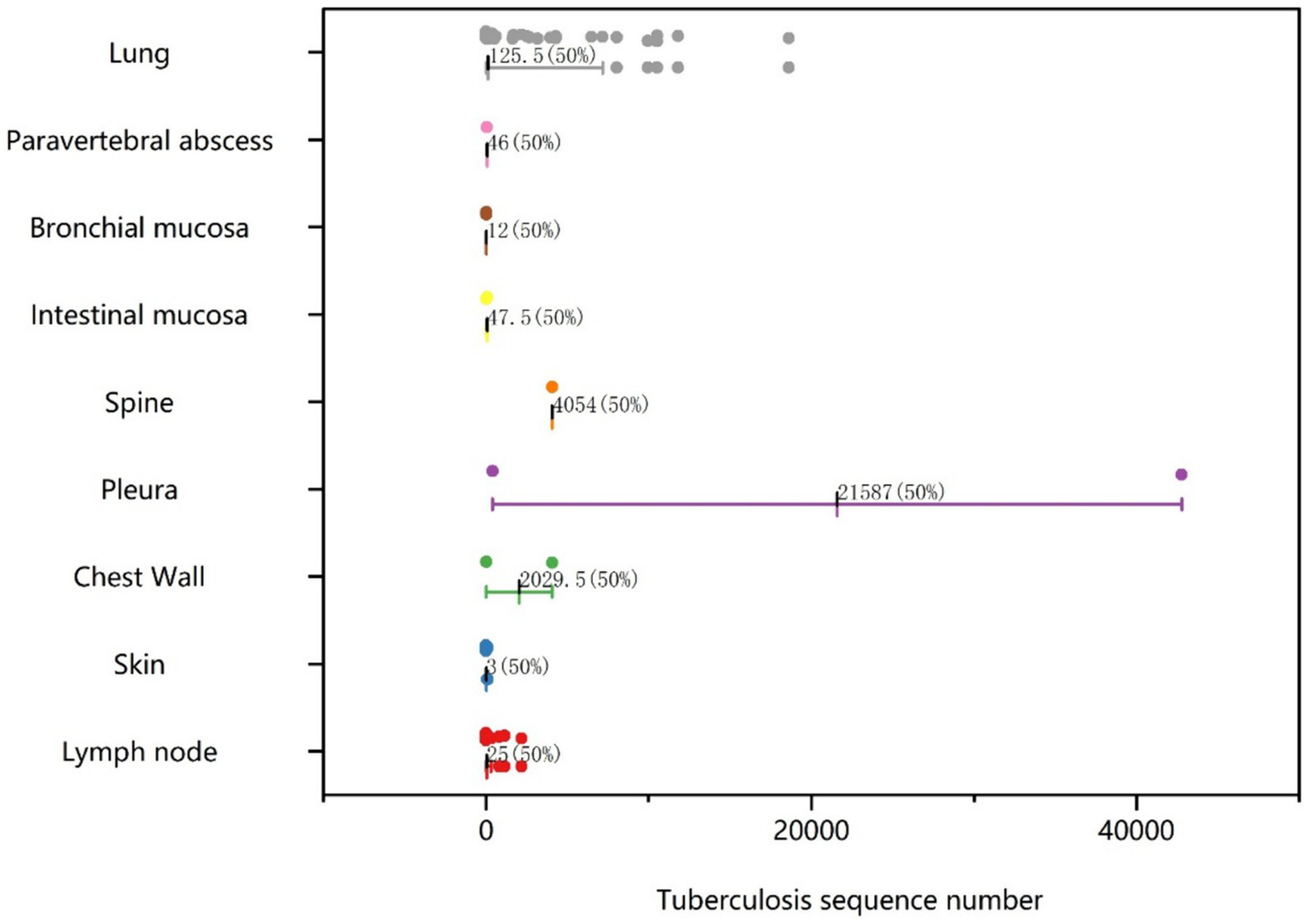 Histological samples spanned 10 distinct tissues: intestinal mucosa, lung, abdominal wall, spine, lymph node, skin, chest wall, pleura, bronchial mucosa, and paravertebral abscess. As depicted in Figure 2, positive results for TB were obtained from histological samples of all tissues except pleura. The results confirmed the efficacy of tNGS in identifying TB across diverse samples. Notably, 48 of 52 lung specimens and three pleural specimens were positive for PTB, with only seven cases undetected. For lymph node samples, 15 of 16 cases were identified, while 11 of 13 cases were detected for skin samples. In the case of spinal and paravertebral abscess specimens, two of three cases were identified. All cases of bronchial, chest wall, and intestinal TB were successfully detected. Additionally, scatter plots were used to display the number of nucleic acid sequences detected by tNGS in various TB-positive specimens (Figure 3). The median TB sequences of histological specimens of lung, paravertebral abscess, bronchial mucosa, intestinal mucosa, spine, pleura, chest wall, and lymph node were 125.5, 46, 12, 47.5, 4,054, 21,587, 2029.5, 3, and 25, respectively. These results revealed that the majority of histological samples contained few bacteria, demonstrating the utility of tNGS as a potent diagnostic tool for samples with low bacterial load.