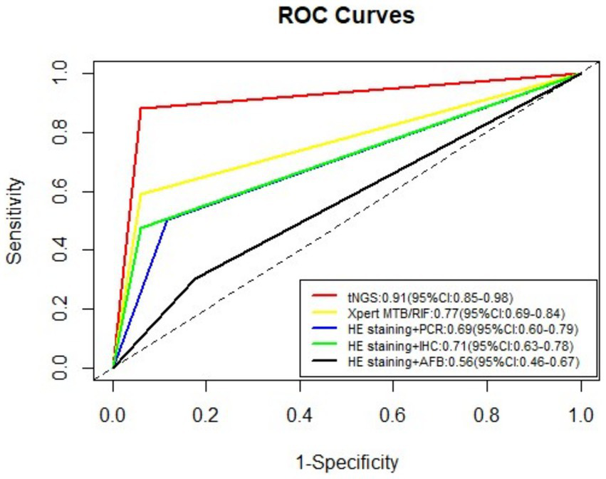 We assessed the utility of tNGS using tissue samples based on true predictive ability, pathogenic positivity rate, and diagnostic accuracy. The results showed that tNGS achieved a sensitivity of 88.2% and a specificity of 94.1%, with its sensitivity significantly surpassing that of the other four tests. This suggests that tNGS possesses the benefit of exceptional sensitivity when it comes to identifying TB in tissues. IHC relies on the production of various polyclonal and monoclonal antibodies through tissue reactions. In particular, polyclonal antibodies possess the capacity to attach to various antigenic epitopes of a particular molecule, allowing tNGS to amplify the detection signal and hence the sensitivity when detecting MTB. Li-jing et al. (2014) discovered that the diagnostic efficacy of the polyclonal antibody IHC labeling technique for TB in pathological tissues was markedly superior to that of the acid-fast staining method (p < 0.005). This also confirmed why tNGS showed such exceptional sensitivity in our study. Nevertheless, tNGS did not exhibit a remarkable difference in specificity to the other four tests, possibly due to the limited sample size tested in this study, consequently leading to the introduction of statistical errors. Therefore, we integrated sensitivity and specificity to investigate the true predictive ability of tNGS for TB. The results revealed that tNGS surpassed the other four tests, as evidenced by its higher AUC (0.91).