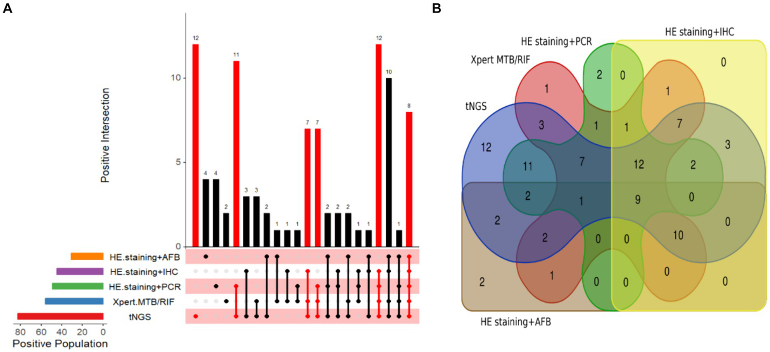 Visualization of TB detection test results. (A) Upset diagram of positive tests for the included patients. (B) Venn diagram of positive tests for TB patients.