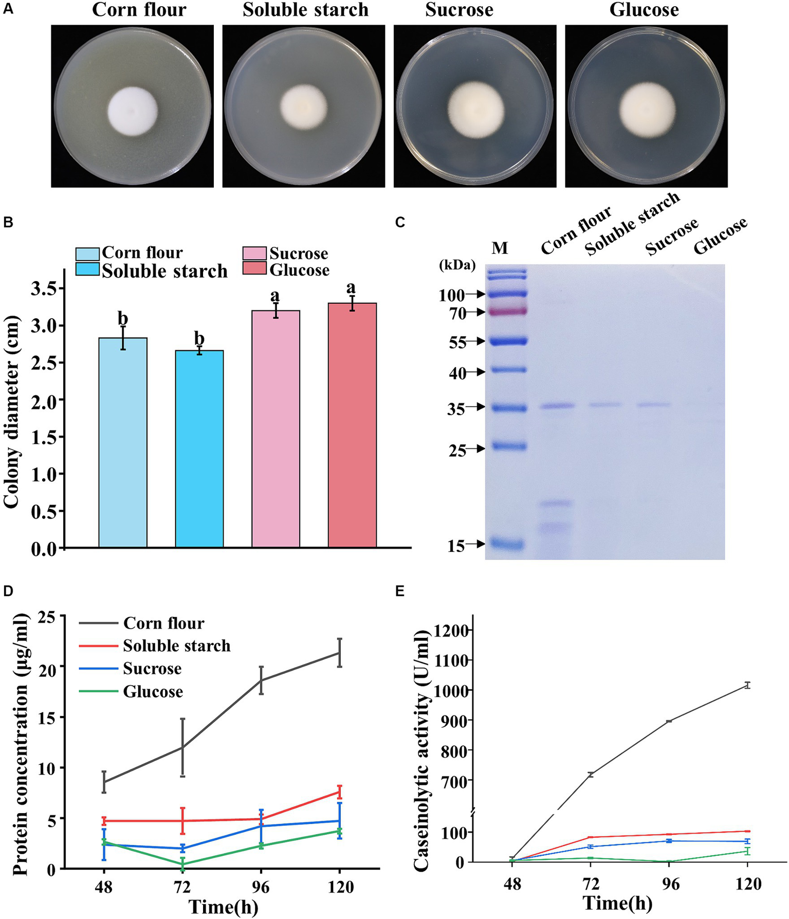 Phenotypic analysis of P. lilacinum grown on different carbon sources (corn flour, soluble starch, sucrose, and glucose). (A) Colony morphology and (B) colony size of 5-day-old cultures on minimal medium supplemented with different carbon sources at 28°C. Exactly 1 μL of a 1 × 106 conidia/mL suspension was spotted onto the center of the various media. Different lowercase letters represent significant differences (p < 0.05). (C) SDS-PAGE analysis of extracellular proteins from P. lilacinum grown for 96 h on different carbon sources. (D) Concentration of extracellular protein and (E) caseinolytic activity of P. lilacinum grown on different carbon sources at different culture times (48, 72, 96, and 120 h). The values represent the mean of three biological replicates, with error bars indicating standard deviations.