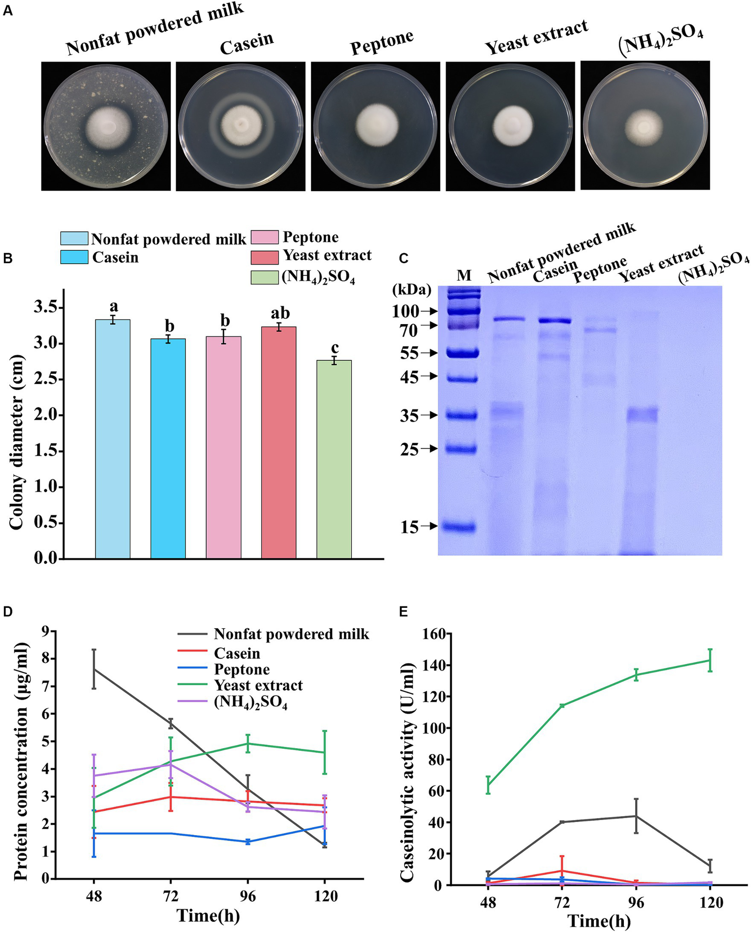 Phenotypic analysis of P. lilacinum grown on different nitrogen sources (nonfat powdered milk, casein, peptone, yeast extract, and (NH4)2SO4). (A) Colony morphology and (B) colony size of 5-day-old cultures on minimal medium supplemented with different nitrogen sources at 28°C. Exactly 1 μL of 1 × 106 conidia/mL suspension was spotted onto the center of the various media. Different lowercase letters represent significant differences (p < 0.05). (C) SDS-PAGE analysis of extracellular proteins from P. lilacinum grown for 96 h on different nitrogen sources. (D) Concentration of extracellular protein and (E) caseinolytic activity of P. lilacinum grown on different nitrogen sources. The values represent the mean of three biological replicates, with error bars indicating standard deviations.
