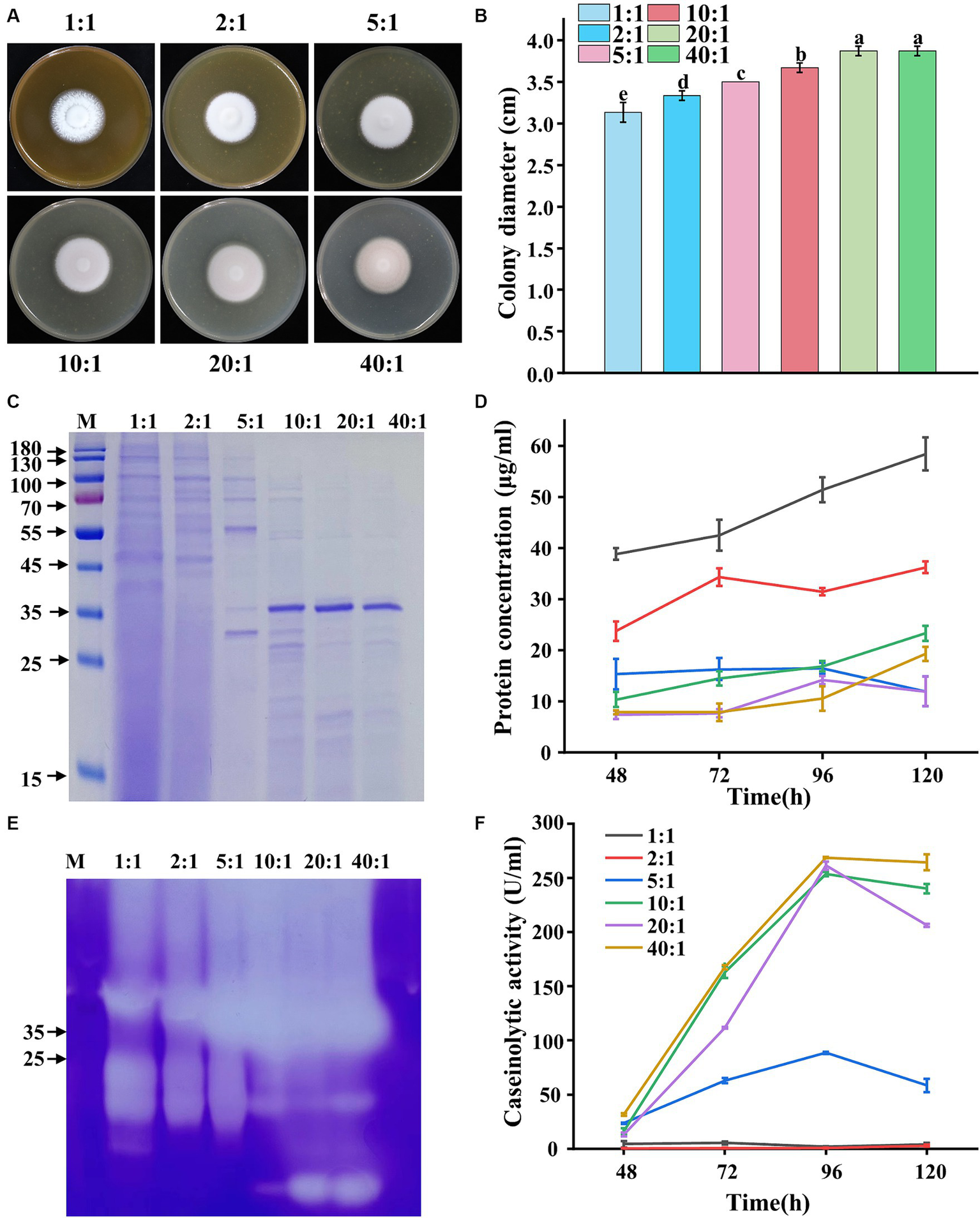 Phenotypic analysis of P. lilacinum grown on different C:N ratios (1:1, 2:1, 5:1, 10:1, 20:1, and 40:1). (A) Colony morphology and (B) colony size of 5-day-old cultures on minimal medium supplemented with different C:N ratios at 28°C. Exactly 1 μL of a 1 × 106 conidia/mL suspension was spotted onto the center of the various media. Different lowercase letters indicate significant differences (p < 0.05). (C) SDS-PAGE analysis of extracellular proteins from P. lilacinum grown for 96 h under different C:N ratios. (D) Concentration of extracellular protein from P. lilacinum. (E) Zymography of gelatinase by secreted proteins of P. lilacinum grown under different C:N ratios during 96 h of liquid fermentation. (F) Caseinolytic activity of P. lilacinum grown under different C:N ratios. The values represent the mean of three biological replicates, with error bars indicating standard deviations.