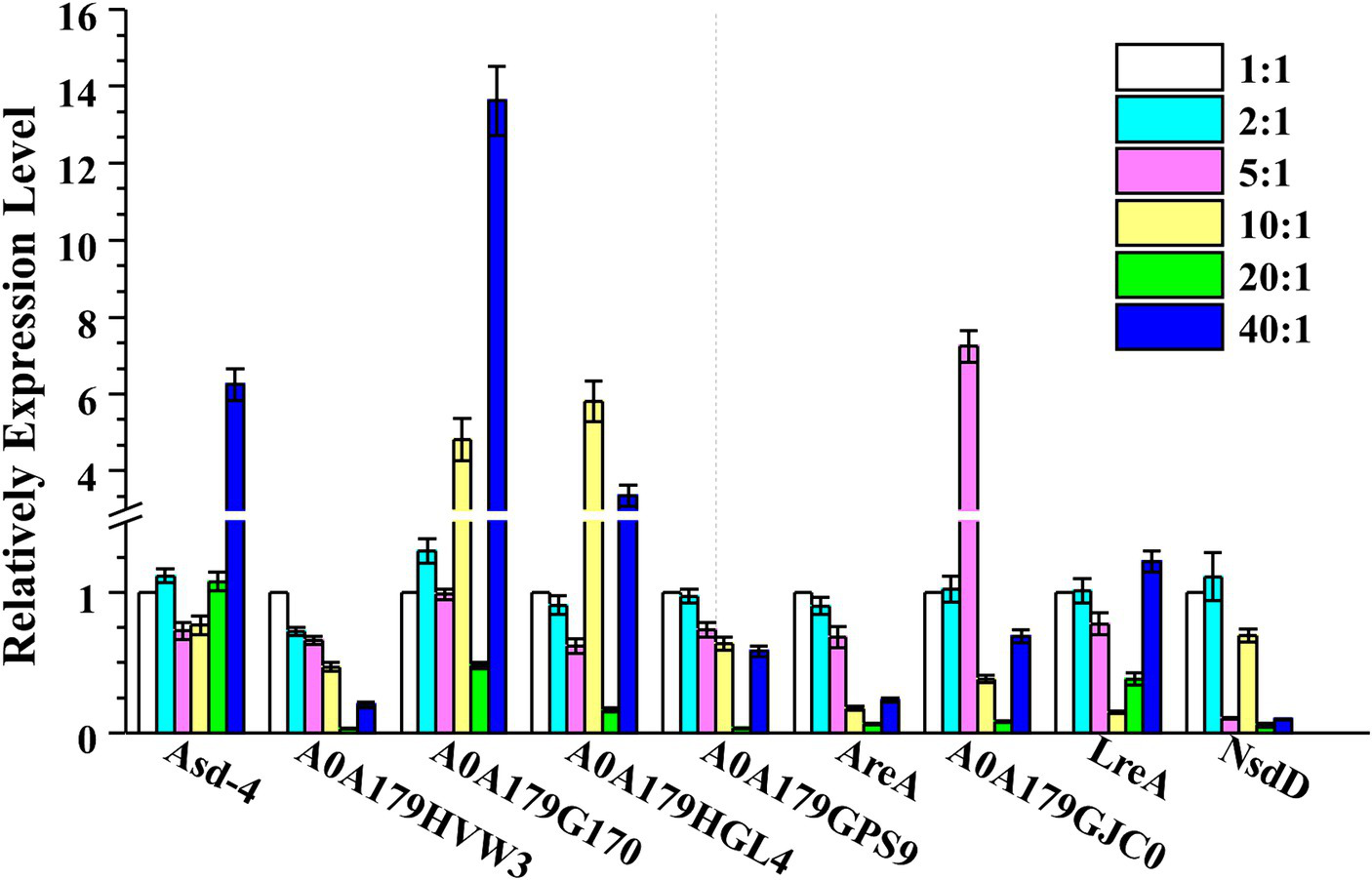 Transcription levels of nine GATA transcription factors, including Asd-4, AreA, LreA, NsdD, SREP, A0A179G170, A0A179HGL4, A0A179GPS9, and A0A179GJC0, were determined by qRT-PCR after cultivating P. lilacinum for 24 h under different C:N ratios (1:1, 2:1, 5:1, 10:1, 20:1, and 40:1). The Actin gene was used for data normalization. Values represent the mean of three biological replicates, with error bars indicating standard deviations.