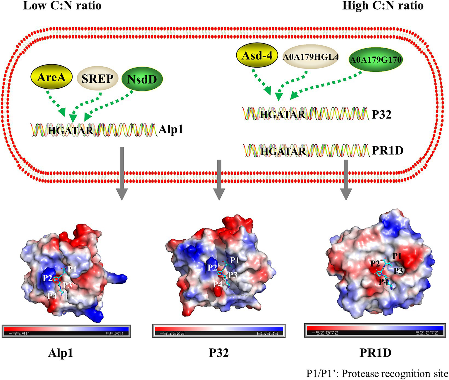 Schematic description of the regulation of the main secreted S8 family serine proteases by GATA transcription factors in P. lilacinum. Under a low C:N ratio, the alkaline serine protease Alp1 was regulated by GATA transcription factors SREP, AreA, and NsdD. Under a high C:N ratio, the proteinase T-like protein P32 and serine endopeptidases PR1D were regulated by GATA transcription factors Asd-4, A0A179G170, and A0A179HGL4. The electrostatic potential distribution on the surface of Alp1, P32, and PR1D is shown, with the electrostatic potential colored from red (negative) to blue (positive). The binding sites on the peptide substrate interacting with the protease-binding pockets S4–S4’ were labeled as P4, P3, P2, P1, P1’, P2’, P3’, and P4’, from N-terminal (N) to C-terminal (C). Substrate cleavage occurred between P1 and P1’.