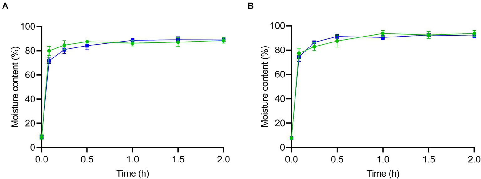 The moisture content (%) of the enoki (A) and wood ear (B) mushrooms during rehydration at 5 (green circles) or 25°C (blue squares) for 2 h. Data are mean values ± standard deviation (n = 9).