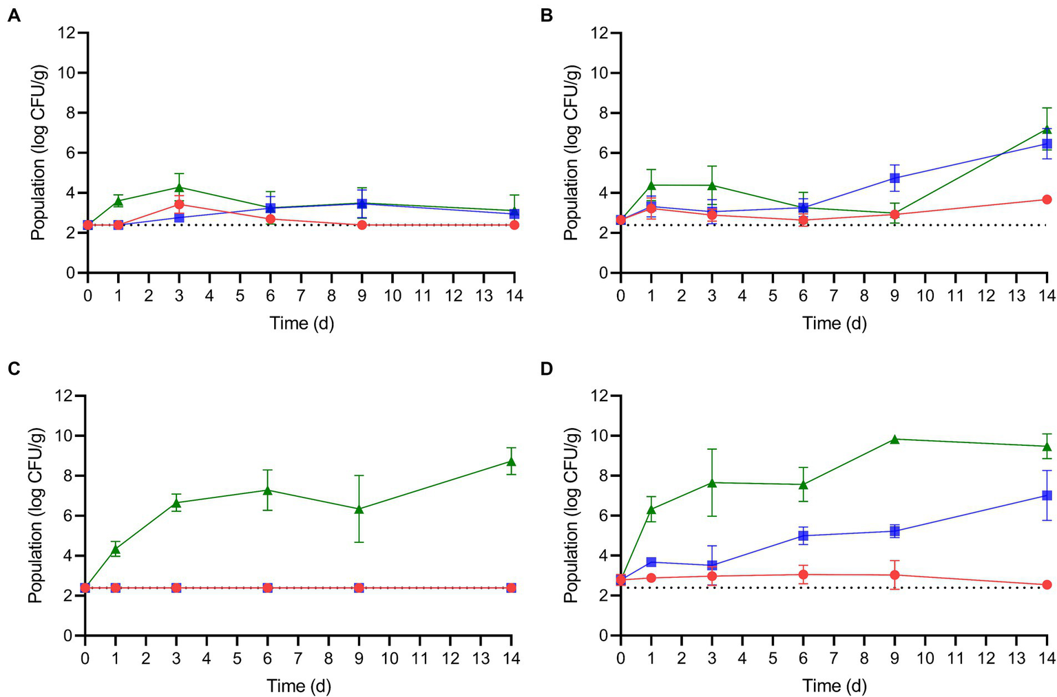 The population dynamics of L. monocytogenes(A,B) and S. enterica(C,D) on rehydrated enoki mushrooms during storage at 5 (red circles), 10 (blue squares) or 25°C (green triangles) for 14 days. Mushrooms were rehydrated at either 5 (A,C) or 25°C (B,D). Data are mean values ± standard deviation (n = 9). The dotted horizontal line indicates the lower level of enumeration (2.39 log CFU/g).
