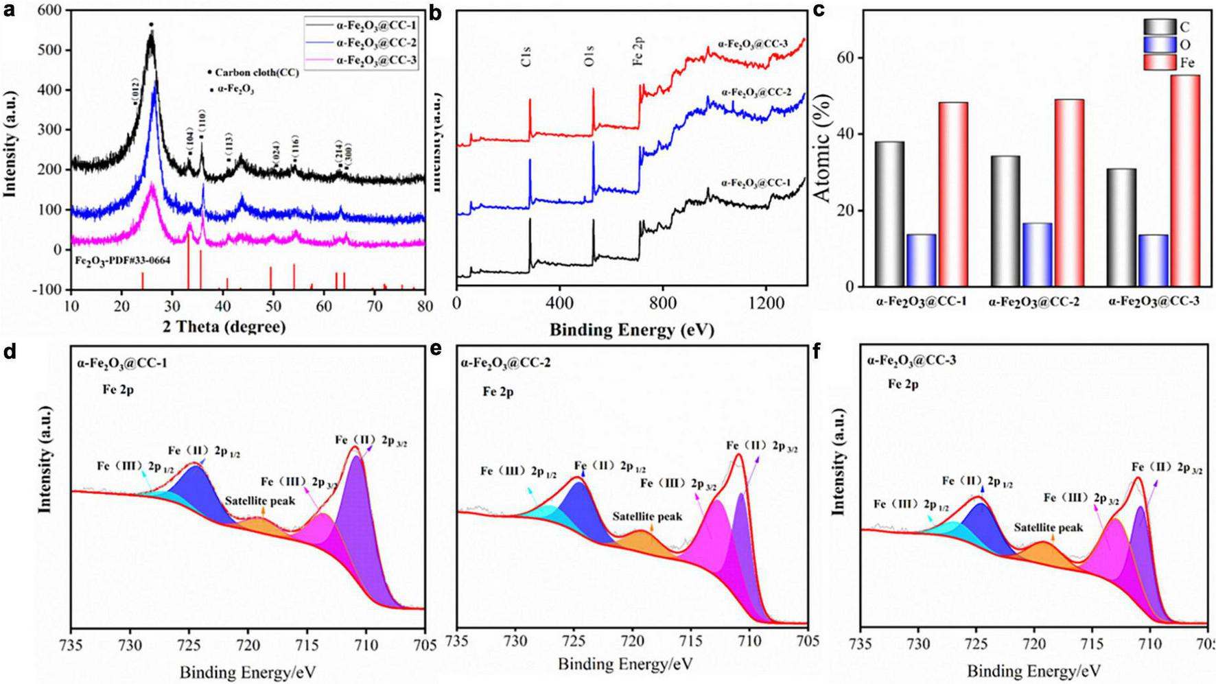 (a) XRD patterns of different α-Fe2O3@CC, (b) XPS total spectrum of different α-Fe2O3@CC, (c) different α-Fe2O3@CC With atomic ratio, (d) High-resolution Fe2p spectrums of α-Fe2O3@CC-1, (e) high-resolution Fe2p spectrums of α-Fe2O3@CC-2, (f) High-resolution Fe2p spectrums of α-Fe2O3@CC-3.