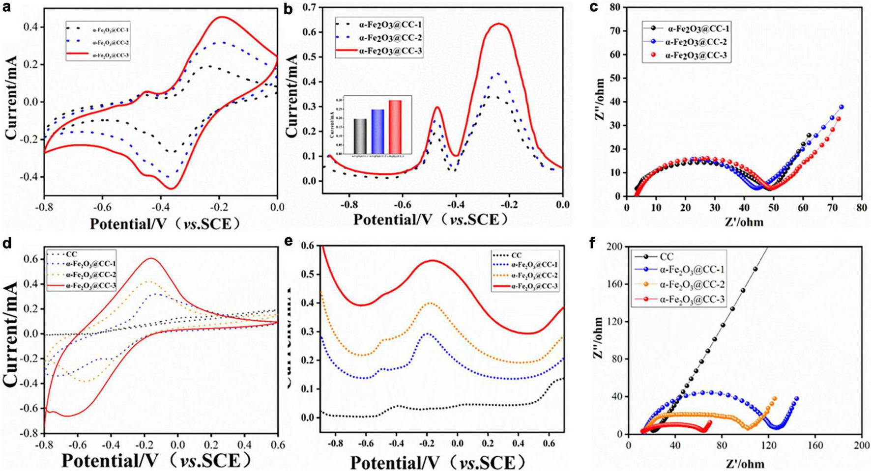 (a–c) Electrochemical behavior of different α-Fe2O3@CC in 0.1M PBS solution containing 2 μM FMN: (a) CVs, (b) DPVs, the inset is FMN redox peak current, (c) EIS curve. (d–f) Electrochemical behavior of different α-Fe2O3@CC electrodes in the S. putrefaciens CN32 bacterial suspension containing 18 mM lactate: (d) CVs, (e) DPVs, (f) EIS curve.