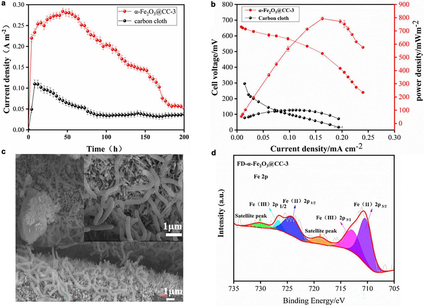 (a) α-Fe2O3@CC and carbon cloth electrodes one-round discharge curve; (b) α-Fe2O3@CC-3 and carbon cloth power curve; (c) α-Fe2O3@CC-3 The growth of biofilm after one round of discharge. (d) High-resolution Fe2p spectrums of α-Fe2O3@CC-3 electrode after one round of discharge.
