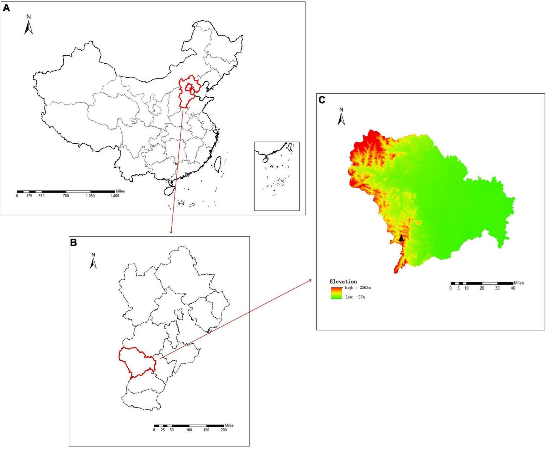 Map of the study area. (A) Map of China. (B) Map of Hebei Province. (C) Map of Shijiazhuang City, Hebei Province, Black triangle marks location where patient went mountain climbing, Jingxing County, Shijiazhuang City, Hebei Province, China.