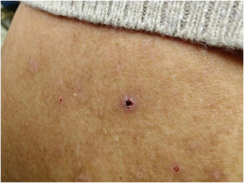 A 47-year-old male urban resident, who had taken his pet dog mountain climbing at Jingxing County, Shijiazhuang, Hebei Province (Figure 1) a week before, presented with persistent fever and subsequently self-administered Cefalexin Tablets. During this visit, his body temperature was recorded as 38.1°C, blood pressure was 130/90 mmHg, and auscultation revealed normal sounds. His heart rate was 70 beats per minute, regular, with no murmurs detected. The patient exhibited symptoms including sore throat, decreased appetite, chest tightness, and fatigue. Physical examination revealed ulcerations at the site of insect bites, characterized by scabs with a central depression surrounded by whitish-red circular areas, approximately the size of a mung bean. There was no associated pain or itching. The scab was located on the left side of the abdomen (Figure 2). A blood routine examination showed an elevated neutrophil count and decreased lymphocyte and platelet counts. The patient was treated with doxycycline, orally, 0.2 g per dose, once daily for 7 days. After the treatment, there was a significant improvement in the patient’s condition 2 days the treatment, with normalization of body temperature, relief of headache.