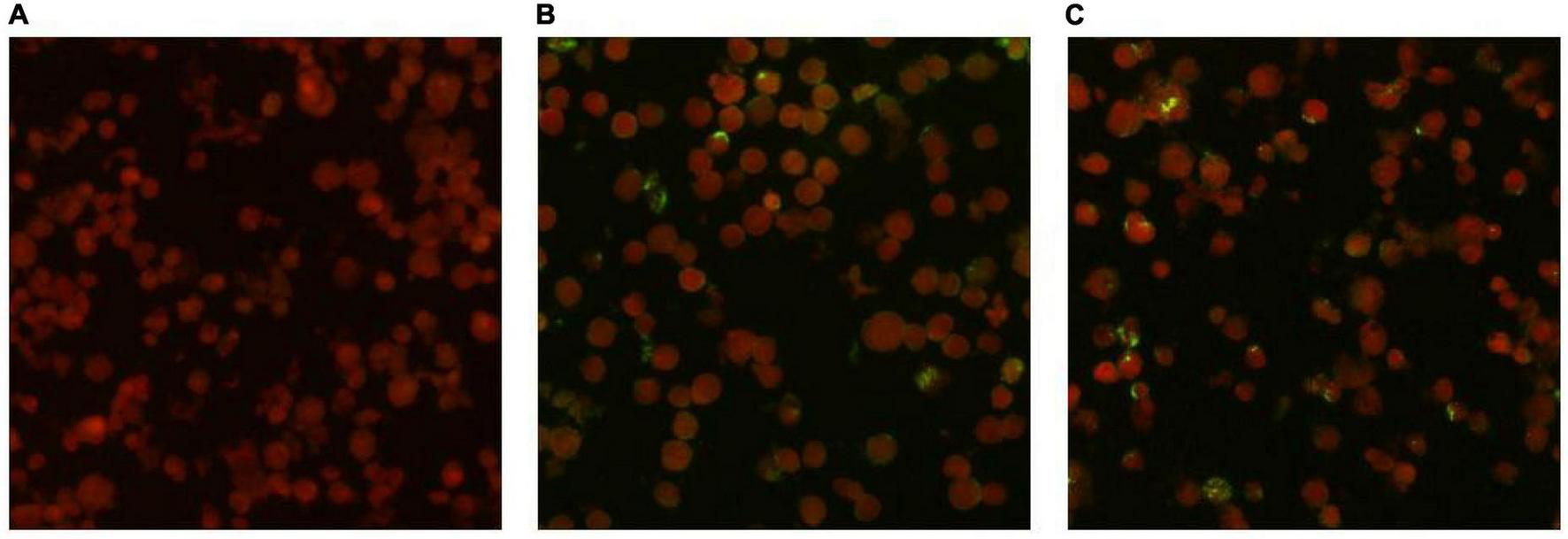Detection results of anti-O. tsutsugamushi IgG in serum by IFA method. (A) Negative control. (B) Acute phase titer: 1:64. (C) Convalescent phase titer: 1:256.