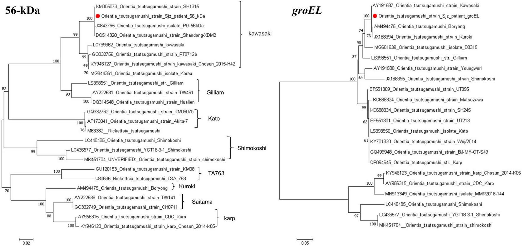 Phylogenetic trees based on the nucleotide sequences of 56-kDa and groEL genes from O. tsutsugamushi strains. Sequences obtained in this study are marked with a red dot before their names.