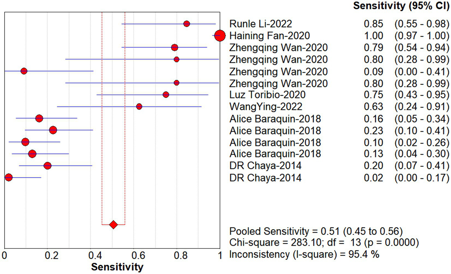Forest plot of sensitivity for quantitative analysis of circulating cell-free DNA in the diagnosis of Echinococcosis.