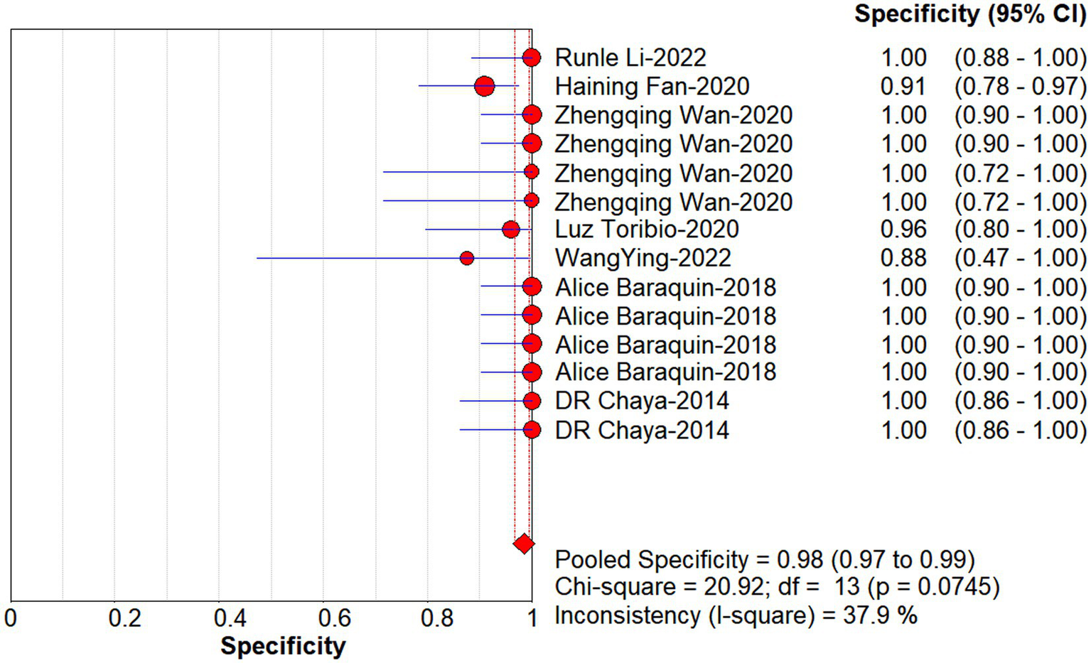 Forest plot of specificity for quantitative analysis of circulating cell-free DNA in the diagnosis of Echinococcosis.