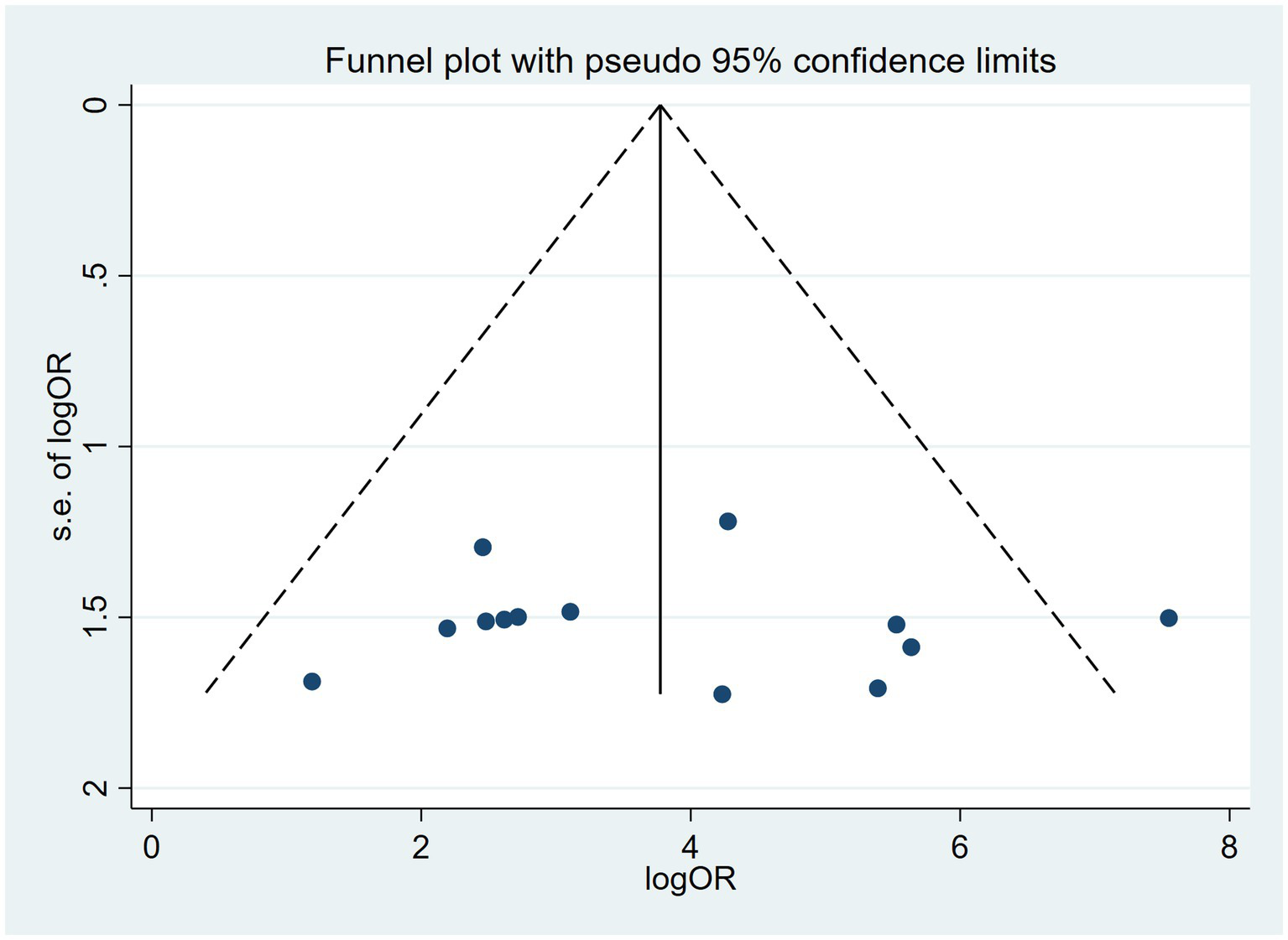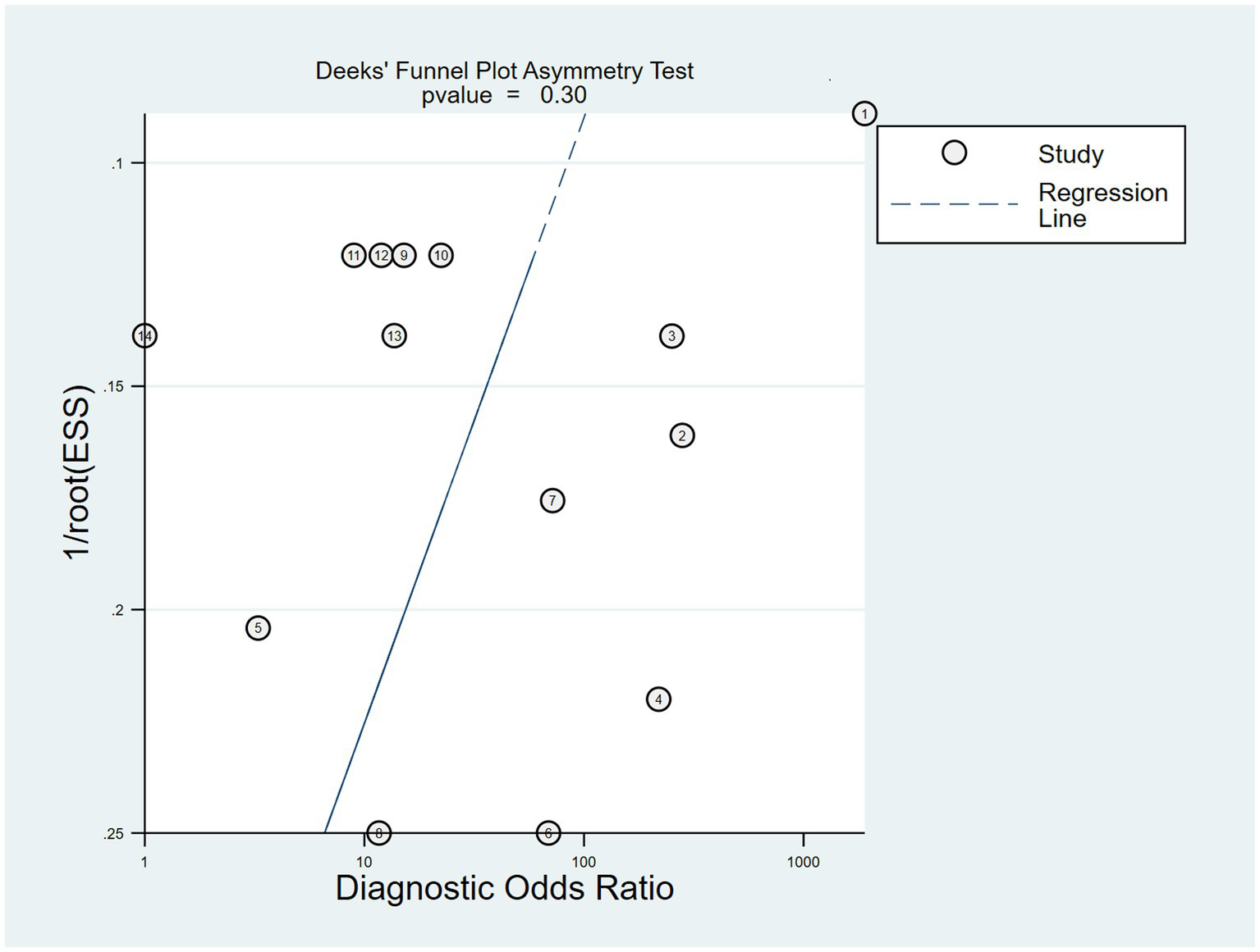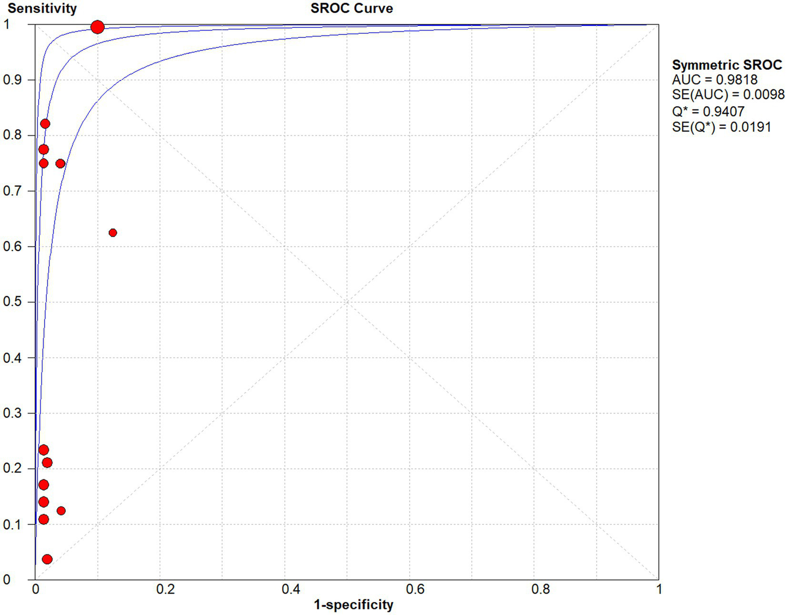 As shown in the SROC curves of echinococcosis, the corresponding points of each study are scattered and do not have a “shoulder-arm” appearance. Spearman’s correlation coefficients P between the logarithm of sensitivity and the logarithm of (1-specificity) were calculated, and p = 0.462, confirming that the threshold effect was not significant and the heterogeneity was caused by other reasons.