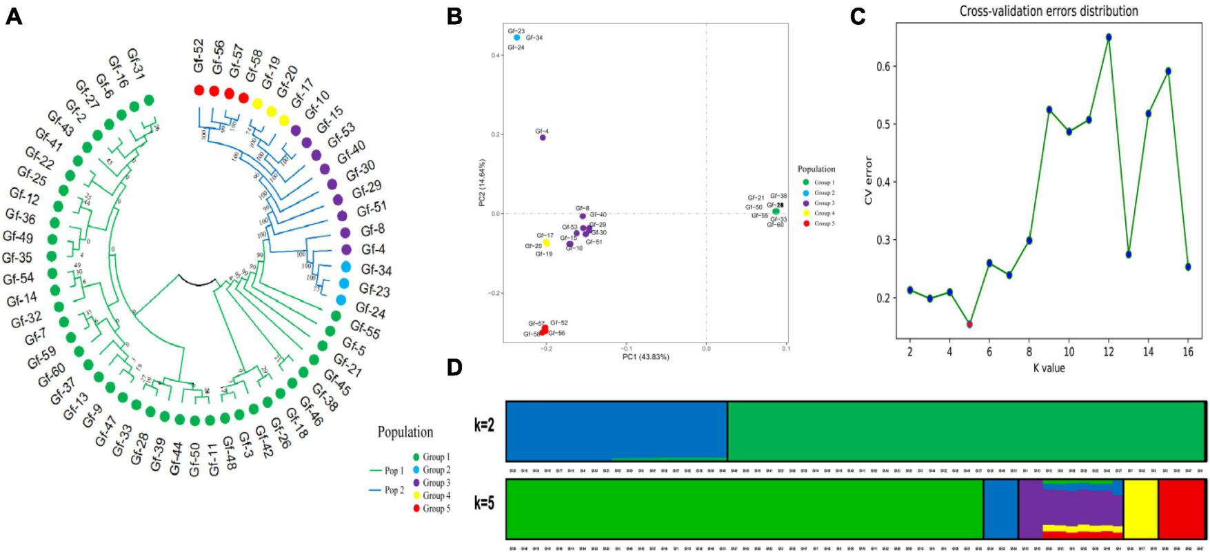 Figure 1. Population genetic analysis of 829,488 SNP loci from 60 G. frondosa. (A) Neighbor-joining phylogenetic tree using 829,488 SNPs in 60 G. frondosa. (B) Principal component analysis of the 60 G. frondosa with 829,488 SNPs. (C) Cross-validation errors distribution. (D) Population structure of the 60 G. frondosa using 829,488 SNPs based on the Admixture output for K = 5.