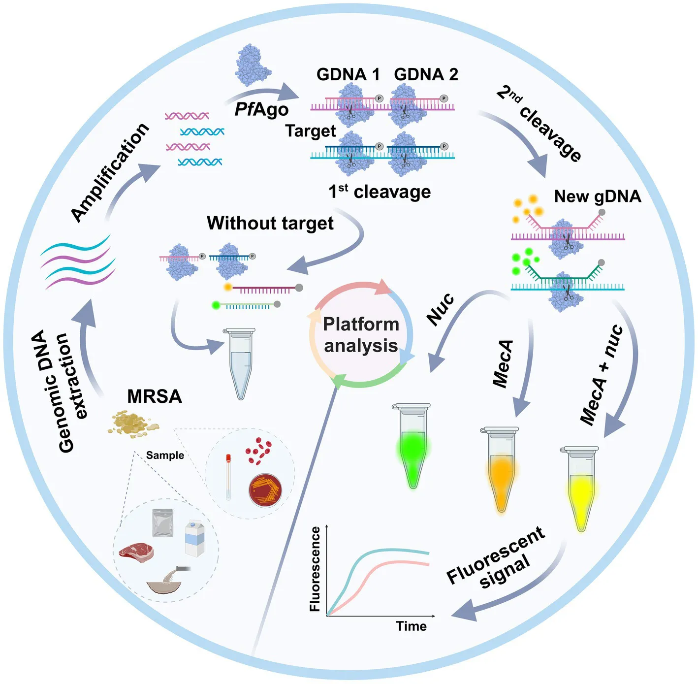 In this work, we introduce a novel assay platform developed by integrating Pyrococcus furiosus Argonaute (PfAgo) with recombinase polymerase amplification (RPA), which was designed for the simultaneous detection of the nuc and mecA genes in MRSA.