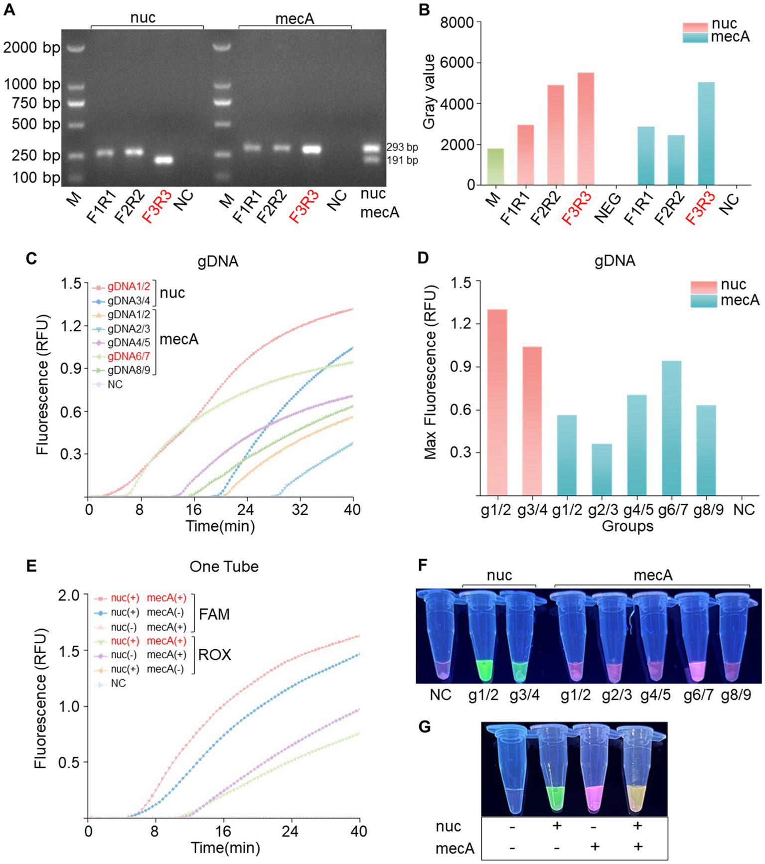 Primer and gDNA screening for single-tube dual-gene reactions. (A) Screening of the nuc and mecA genes for single-gene RPA primers revealed the optimal choice to be the F3R3 primer combination, followed by dual-gene single-tube amplification electrophoresis. (B) Analysis of grayscale values from the electrophoresis bands confirmed the superiority of the F3R3 primer combination for both genes. (C) Screening for the best gDNA-probe combination for the nuc and mecA genes included a negative control (NC) using RNase-free water instead of the target plasmid, with RFU indicating relative fluorescence units. (D) Bar charts displaying the highest values achieved during screening. (E) Evaluation of dual-gene single-tube reactions assessing fluorescence signal intensity for different gene combinations, with a negative control (NC) using RNase-free water in place of the target plasmid. (F) Naked-eye visible results showing visually observable outcomes. (G) Visualization of fluorescence images corresponding to panel (E).