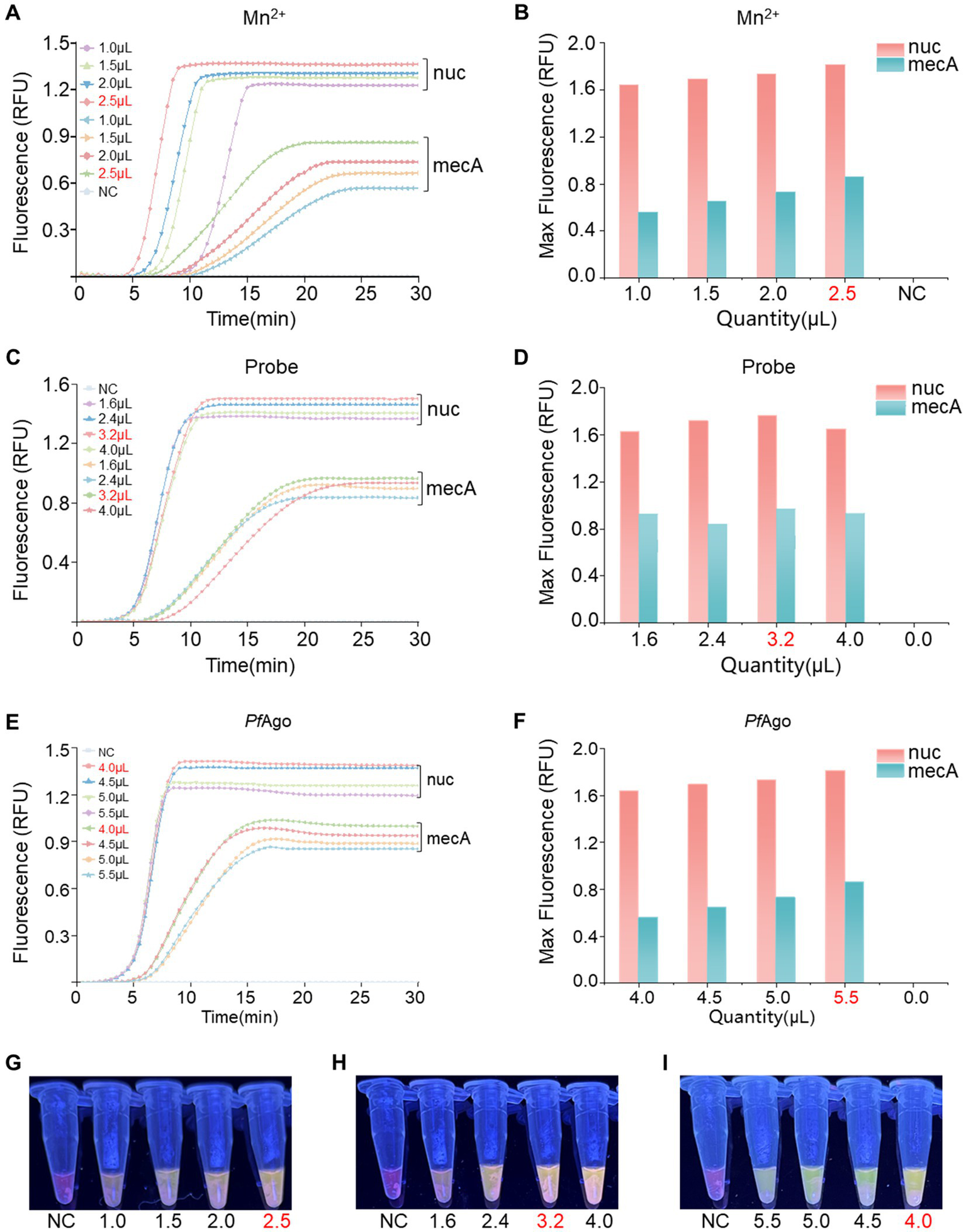 An optimization analysis was performed to determine the ideal reaction system for RPA-PfAgo by adjusting the concentrations of key components (Mn2+, probe, and PfAgo) in the dual-gene reaction setup. Initially, different Mn2+ concentrations (1.0, 1.5, 2.0, and 2.5 μM; Figures 3A,B,G) were assessed, with the highest enzyme cleavage efficiency observed at 2.5 μM Mn2+. Subsequently, the influence of varying probe concentrations on both genes was investigated (nuc: 1.0, 1.4, 1.8, and 2.2 μM; mecA: 1.0, 1.4, 1.8, and 2.2 μM; Figures 3C,D,H), revealing optimal concentrations of 1.4 μM for nuc and 1.8 μM for mecA. Finally, different PfAgo concentrations were tested (4.0, 4.5, 5.0, and 5.5 μL; Figures 3E,F,I), and the results demonstrated that 4 μL of PfAgo yielded the most effective results.